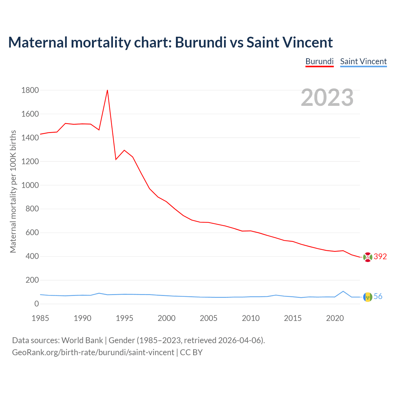The maternal mortality rate, which is the probability of dying during childbirth or within 42 days of pregnancy termination, is 392 deaths per 100,000 live births in Burundi, compared to 56 deaths in Saint Vincent.
