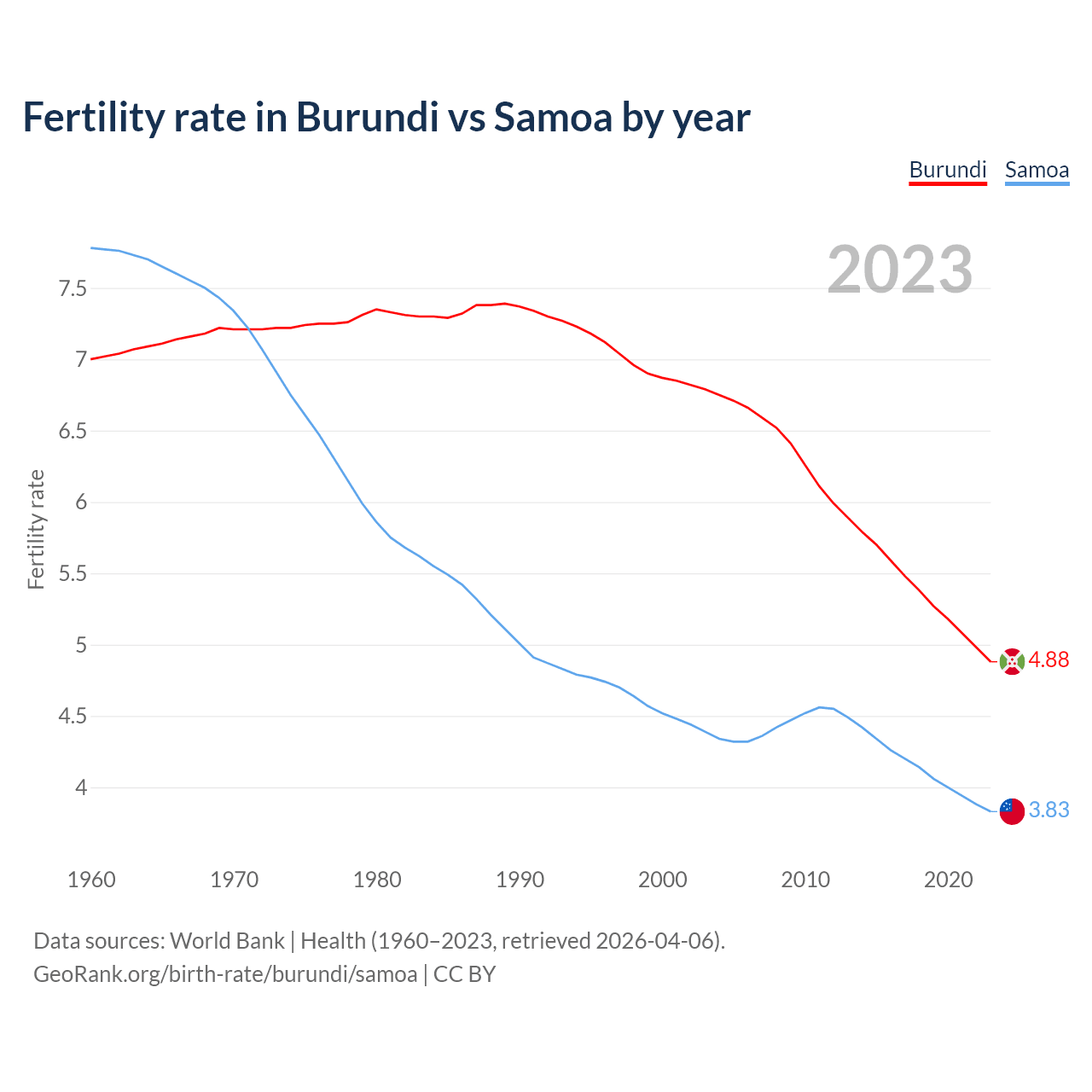 1960 vs 2023, the fertility rate has decreased by 30.3% in Burundi and by 50.8% in Samoa — in 1960, it was 7 and 7.78, respectively.