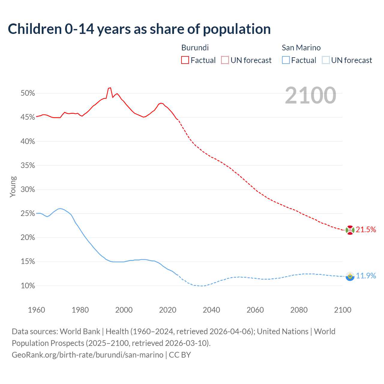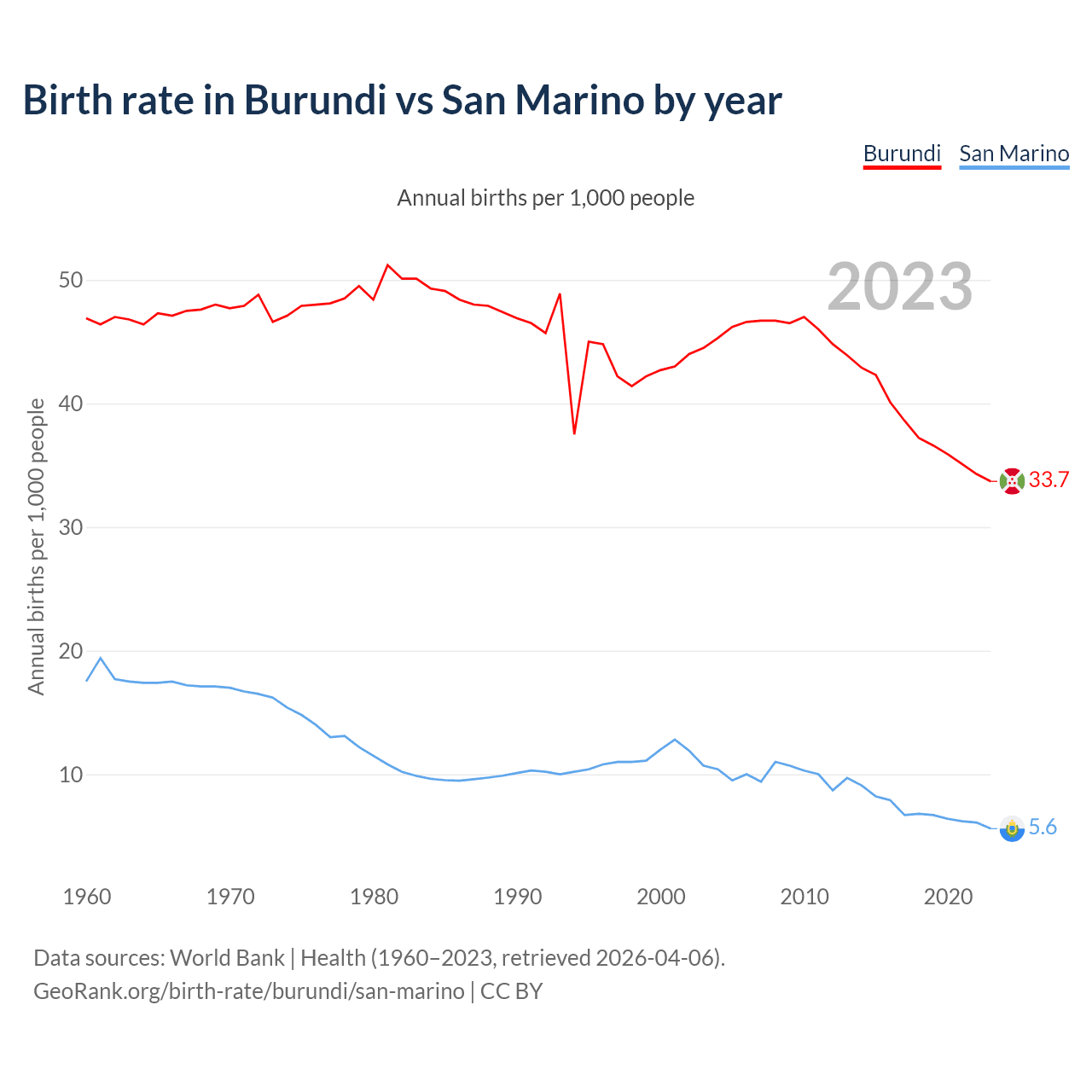 Burundi has an annual birth rate of 33.7 births per 1,000 people, compared to 5.6 for San Marino. The average number of children a woman is expected to have during her lifetime — the fertility rate, is 4.88 in Burundi and 1.15 in San Marino — 76.4% difference.