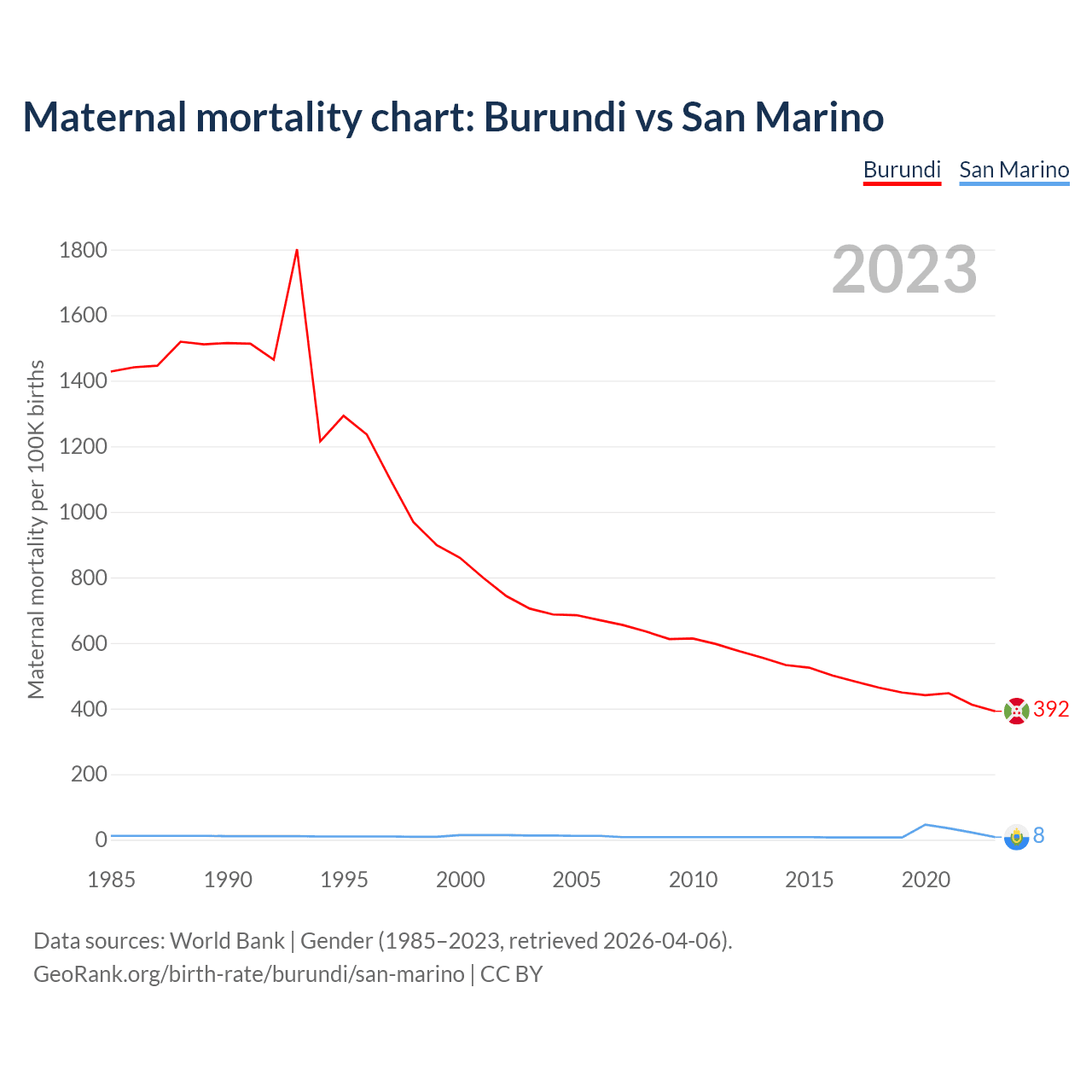 The maternal mortality rate, which is the probability of dying during childbirth or within 42 days of pregnancy termination, is 392 deaths per 100,000 live births in Burundi, compared to 8 deaths in San Marino.