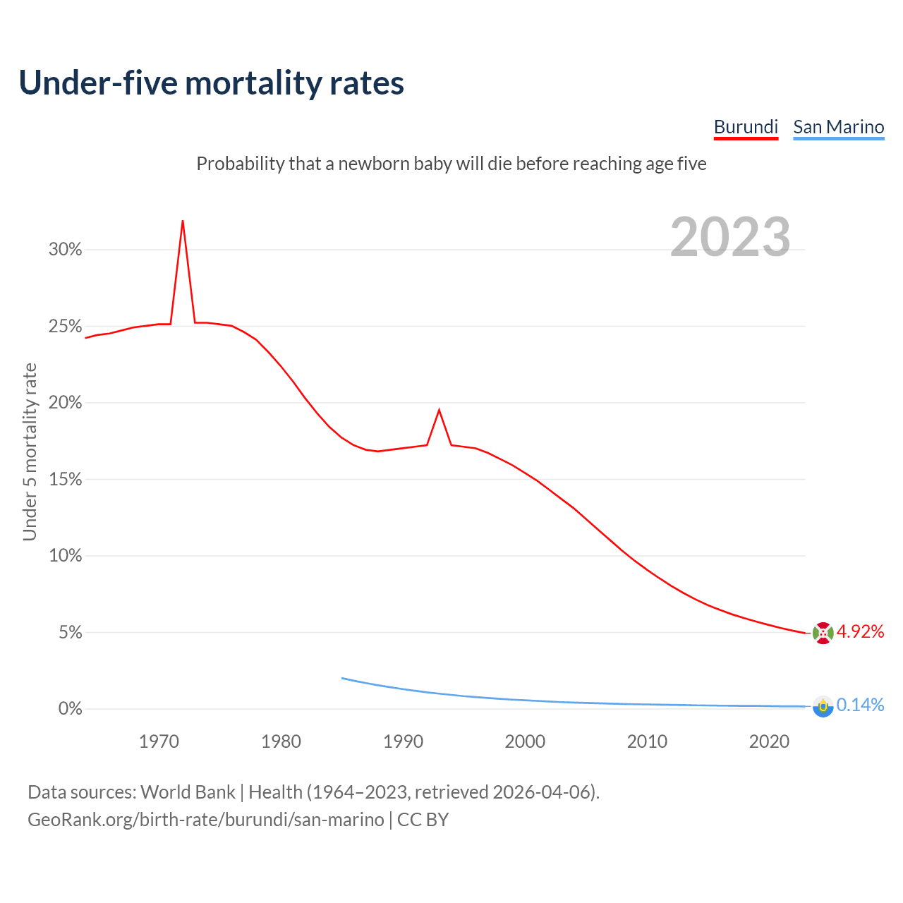 The chance that a newborn baby will die before reaching age five is 4.92% in Burundi and 0.14% in San Marino. Above is a chart with historical data on under-five mortality rates.