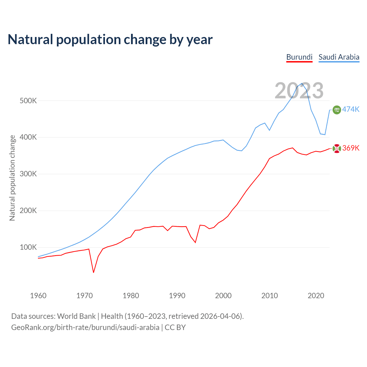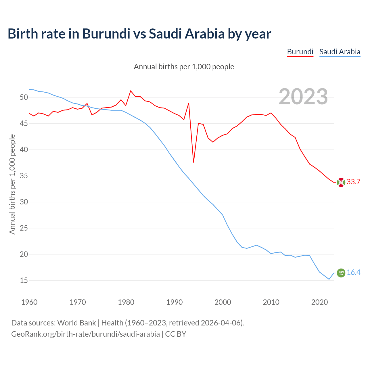 Burundi has an annual birth rate of 33.7 births per 1,000 people, compared to 16.4 for Saudi Arabia. The average number of children a woman is expected to have during her lifetime — the fertility rate, is 4.88 in Burundi and 2.28 in Saudi Arabia — 53.3% difference.