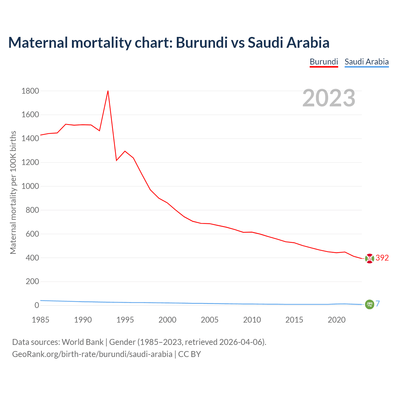 The maternal mortality rate, which is the probability of dying during childbirth or within 42 days of pregnancy termination, is 392 deaths per 100,000 live births in Burundi, compared to 7 deaths in Saudi Arabia.