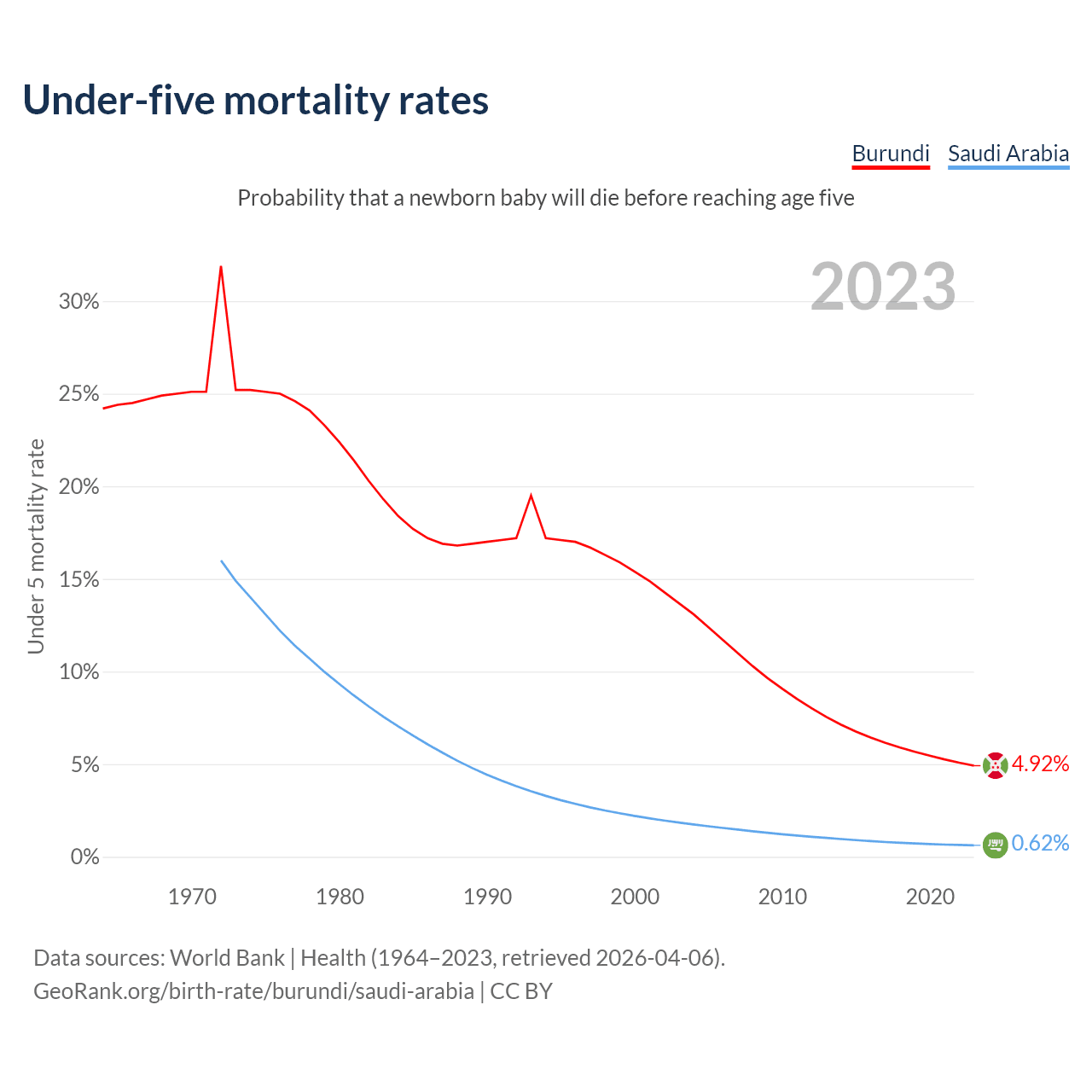 The chance that a newborn baby will die before reaching age five is 4.92% in Burundi and 0.62% in Saudi Arabia. Above is a chart with historical data on under-five mortality rates.