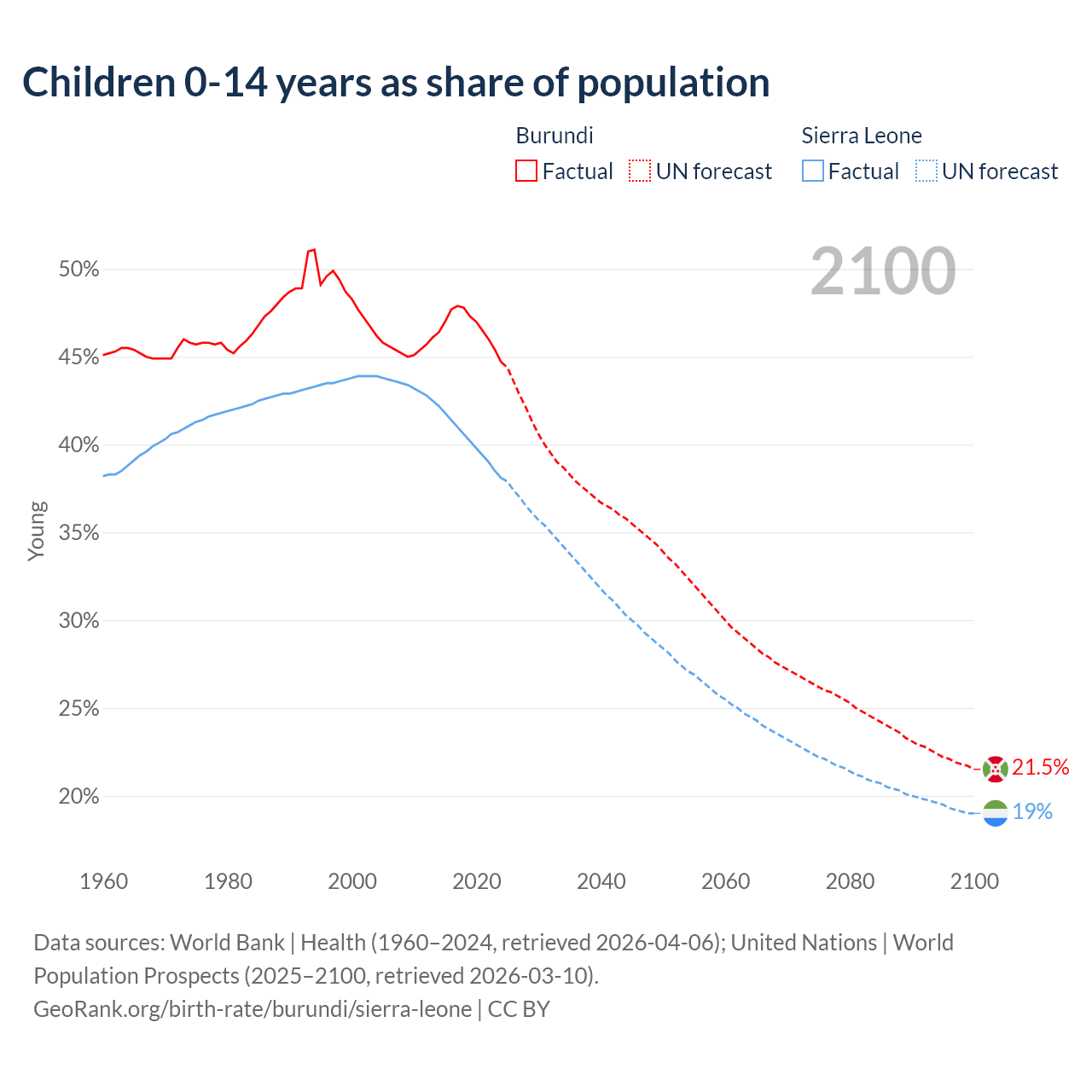 Burundi has an annual birth rate of 33.7 births per 1,000 people, compared to 30.6 for Sierra Leone. The average number of children a woman is expected to have during her lifetime — the fertility rate, is 4.88 in Burundi and 3.79 in Sierra Leone — 22.3% difference.