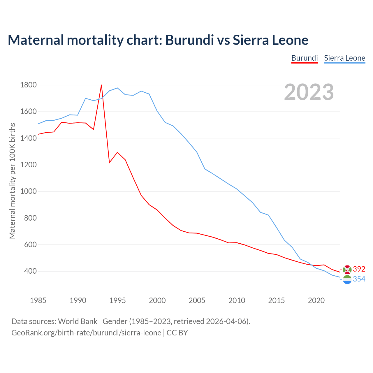 The maternal mortality rate, which is the probability of dying during childbirth or within 42 days of pregnancy termination, is 392 deaths per 100,000 live births in Burundi, compared to 354 deaths in Sierra Leone.