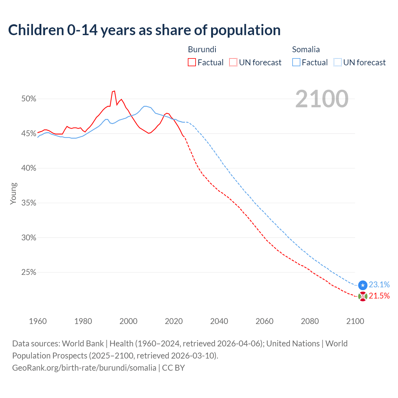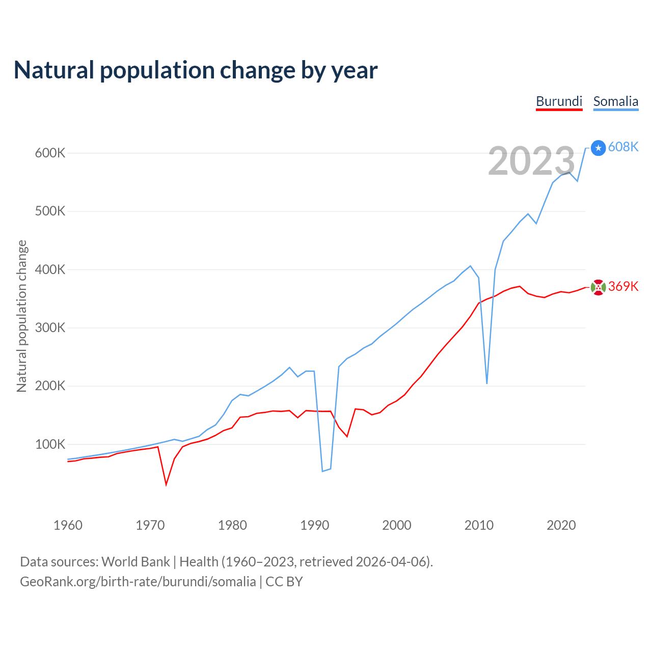Burundi has an annual birth rate of 33.7 births per 1,000 people, compared to 43 for Somalia. The average number of children a woman is expected to have during her lifetime — the fertility rate, is 4.88 in Burundi and 6.13 in Somalia — 25.7% difference.