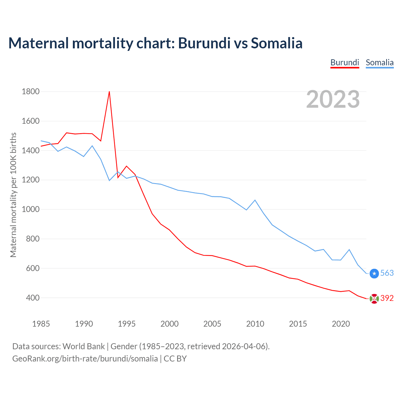 The maternal mortality rate, which is the probability of dying during childbirth or within 42 days of pregnancy termination, is 392 deaths per 100,000 live births in Burundi, compared to 563 deaths in Somalia.
