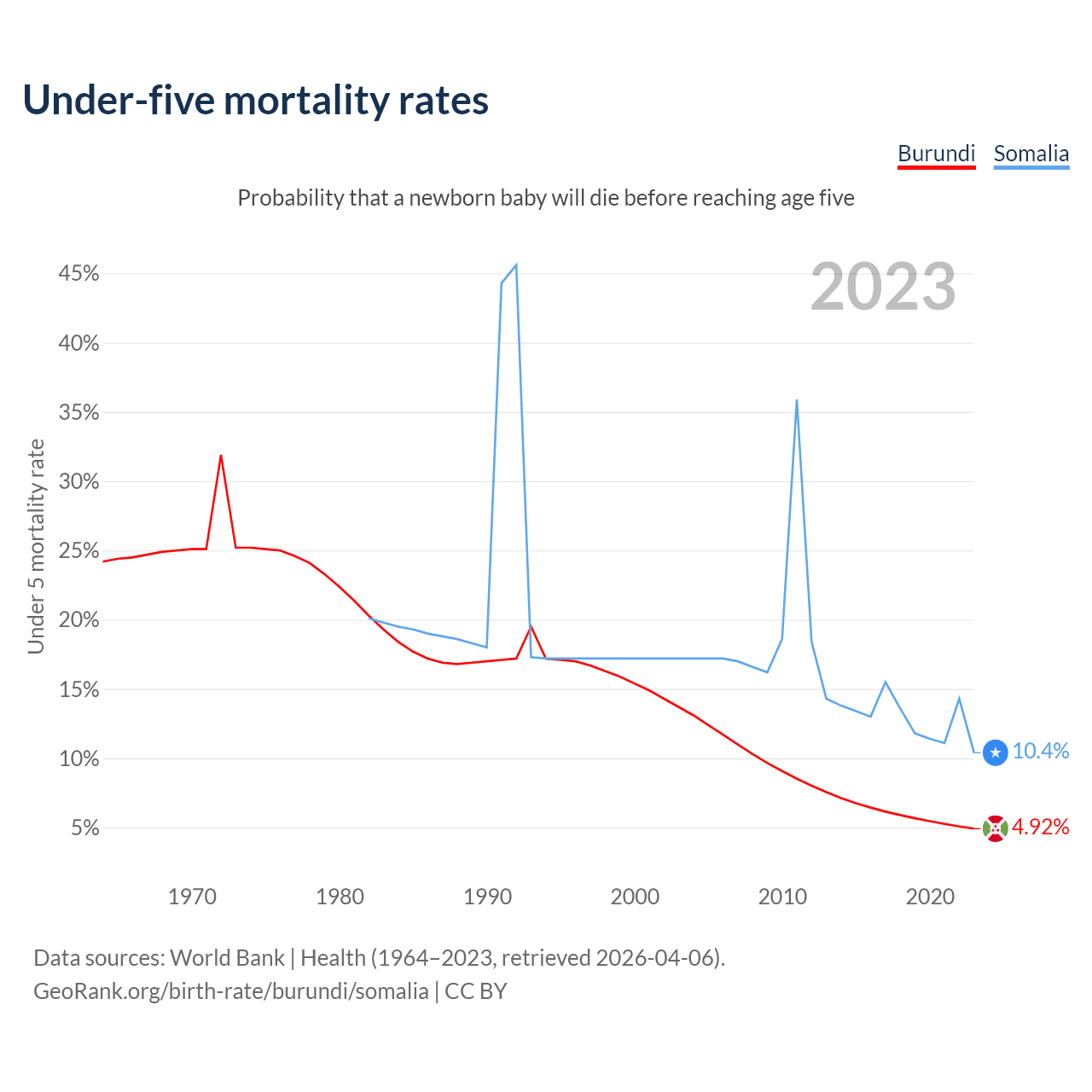 The chance that a newborn baby will die before reaching age five is 4.92% in Burundi and 10.4% in Somalia. Above is a chart with historical data on under-five mortality rates.