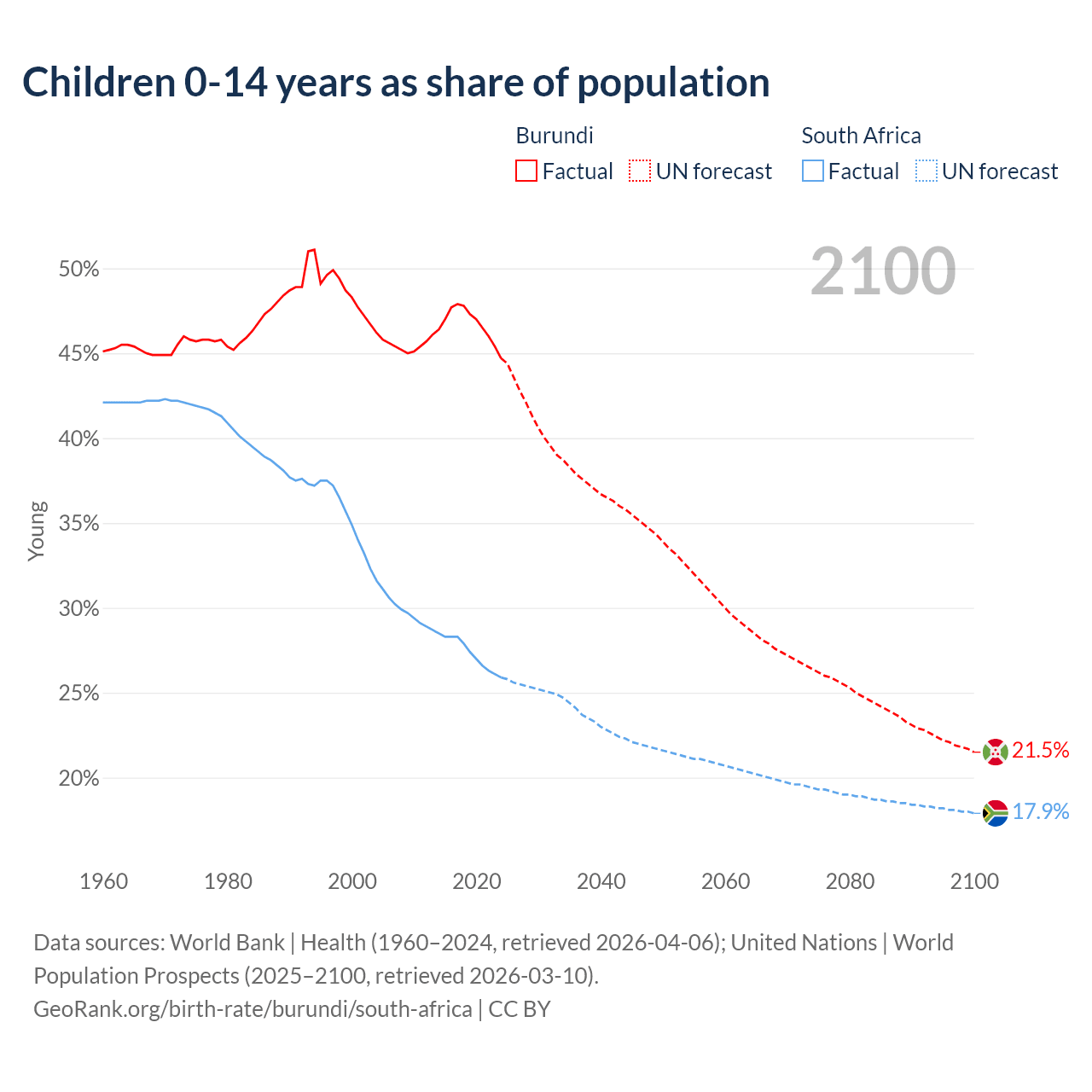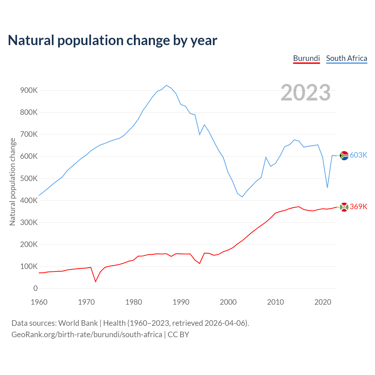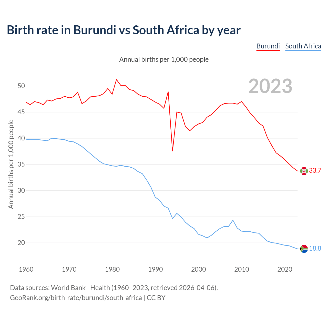 Burundi has an annual birth rate of 33.7 births per 1,000 people, compared to 18.8 for South Africa. The average number of children a woman is expected to have during her lifetime — the fertility rate, is 4.88 in Burundi and 2.22 in South Africa — 54.6% difference.