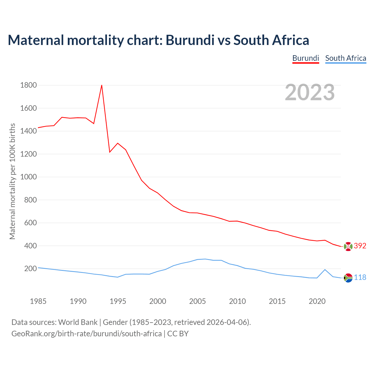 The maternal mortality rate, which is the probability of dying during childbirth or within 42 days of pregnancy termination, is 392 deaths per 100,000 live births in Burundi, compared to 118 deaths in South Africa.