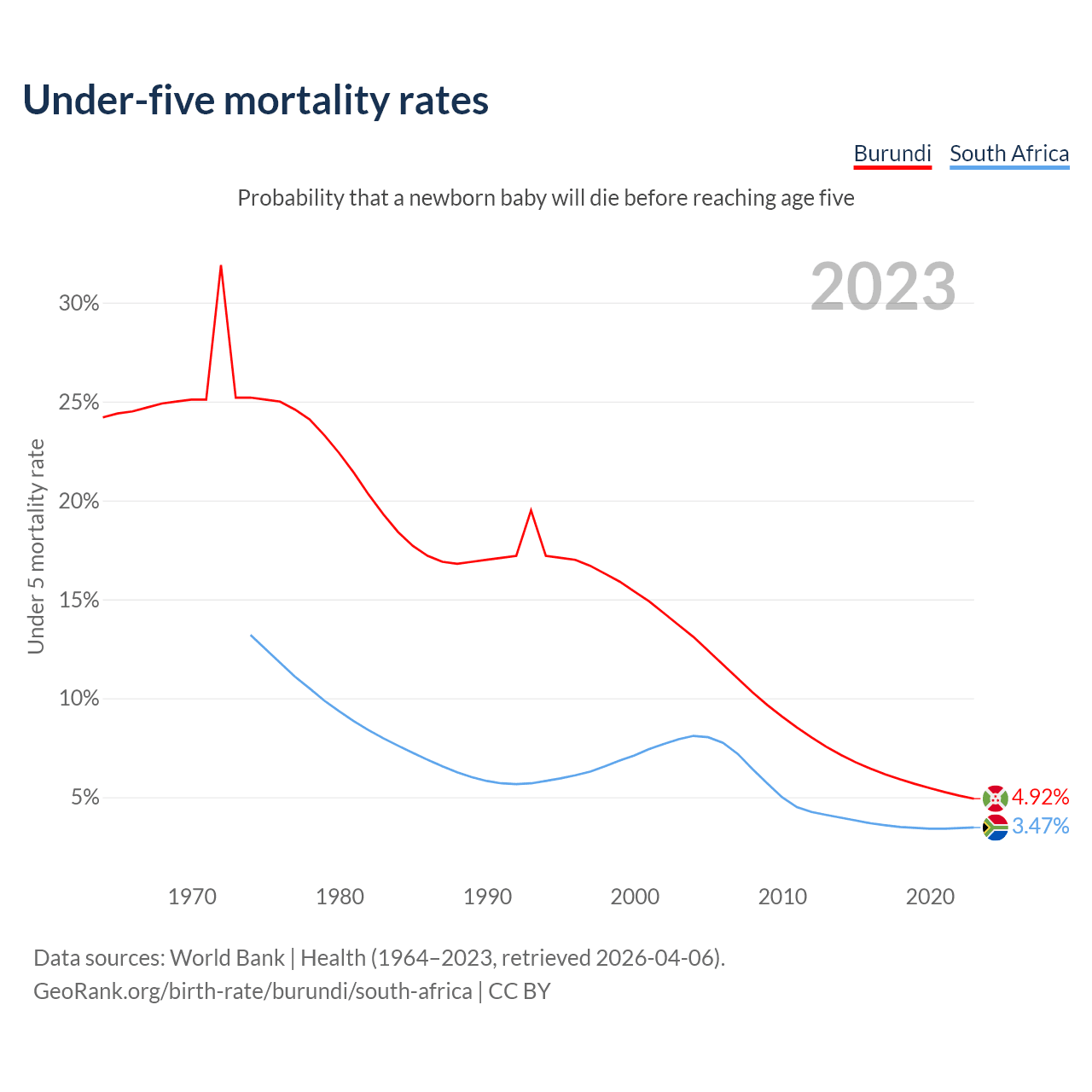 The chance that a newborn baby will die before reaching age five is 4.92% in Burundi and 3.47% in South Africa. Above is a chart with historical data on under-five mortality rates.