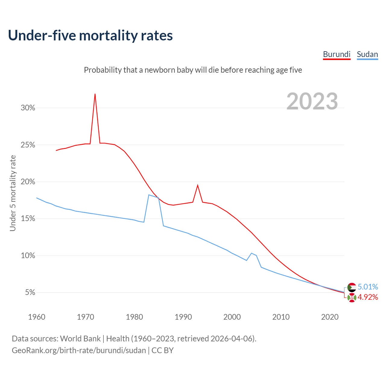 The chance that a newborn baby will die before reaching age five is 4.92% in Burundi and 5.01% in Sudan. Above is a chart with historical data on under-five mortality rates.