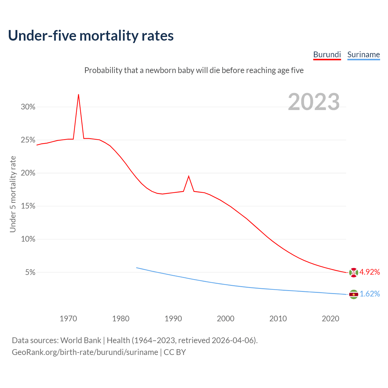 The chance that a newborn baby will die before reaching age five is 4.92% in Burundi and 1.62% in Suriname. Above is a chart with historical data on under-five mortality rates.