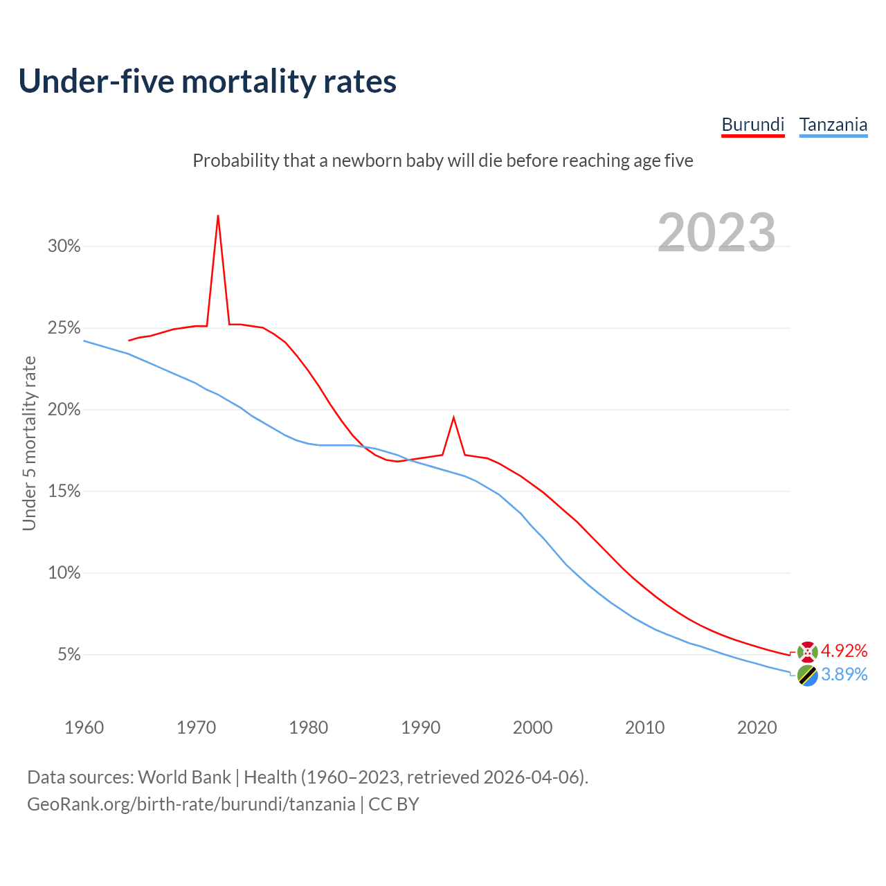 The chance that a newborn baby will die before reaching age five is 4.92% in Burundi and 3.89% in Tanzania. Above is a chart with historical data on under-five mortality rates.