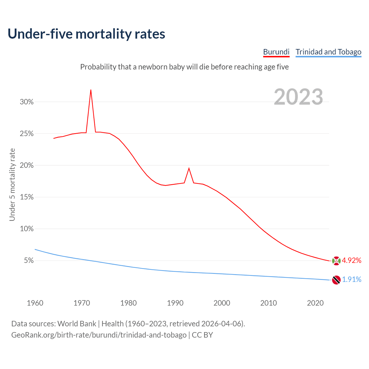 The chance that a newborn baby will die before reaching age five is 4.92% in Burundi and 1.91% in Trinidad and Tobago. Above is a chart with historical data on under-five mortality rates.