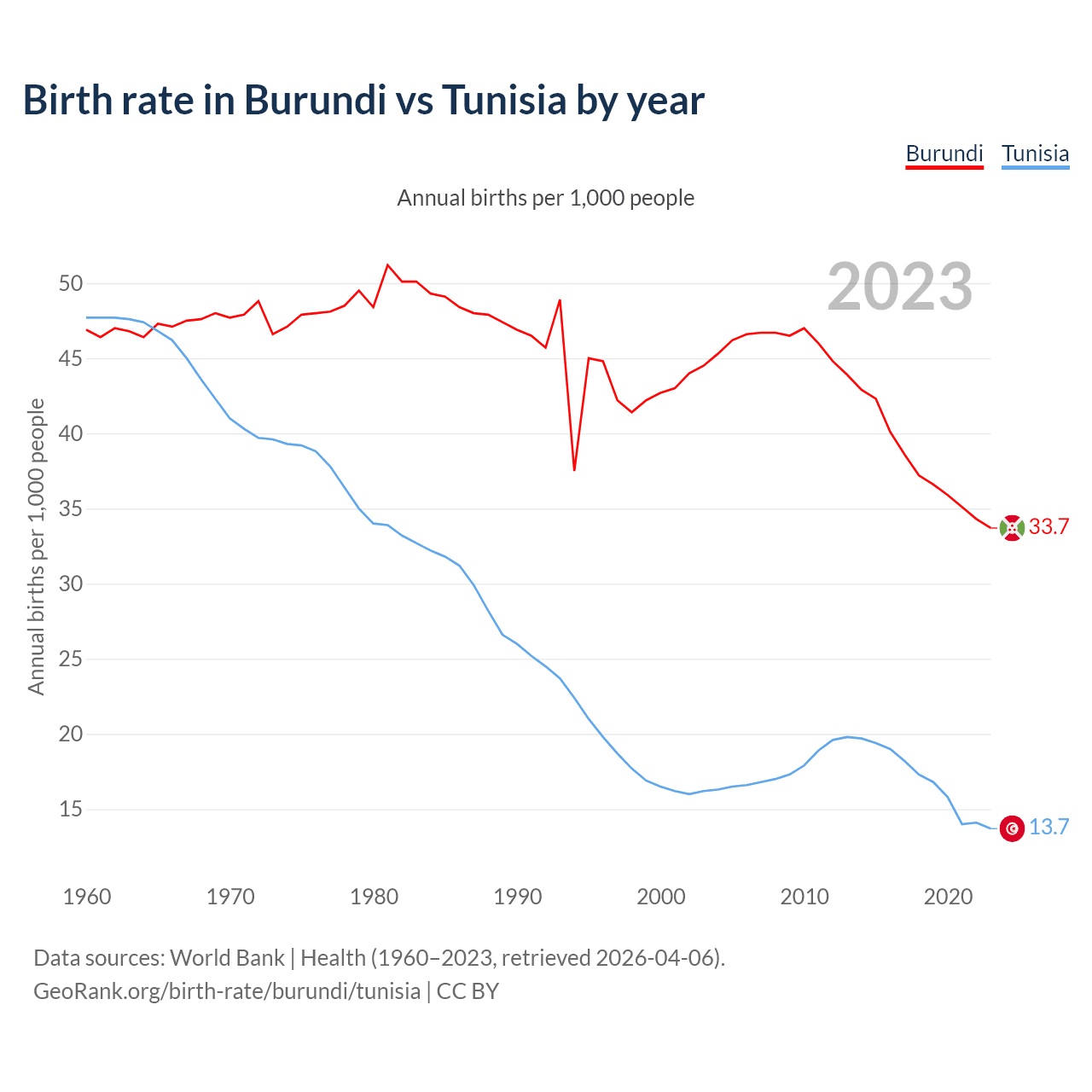 Burundi has an annual birth rate of 33.7 births per 1,000 people, compared to 13.7 for Tunisia. The average number of children a woman is expected to have during her lifetime — the fertility rate, is 4.88 in Burundi and 1.83 in Tunisia — 62.4% difference.