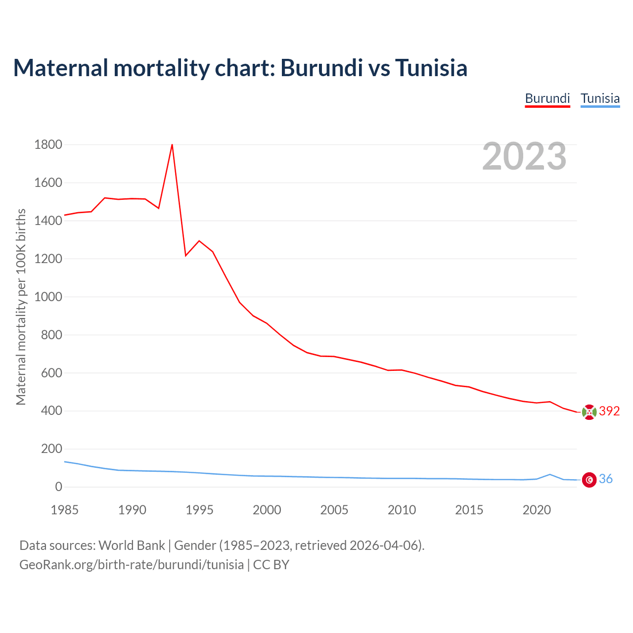 The maternal mortality rate, which is the probability of dying during childbirth or within 42 days of pregnancy termination, is 392 deaths per 100,000 live births in Burundi, compared to 36 deaths in Tunisia.