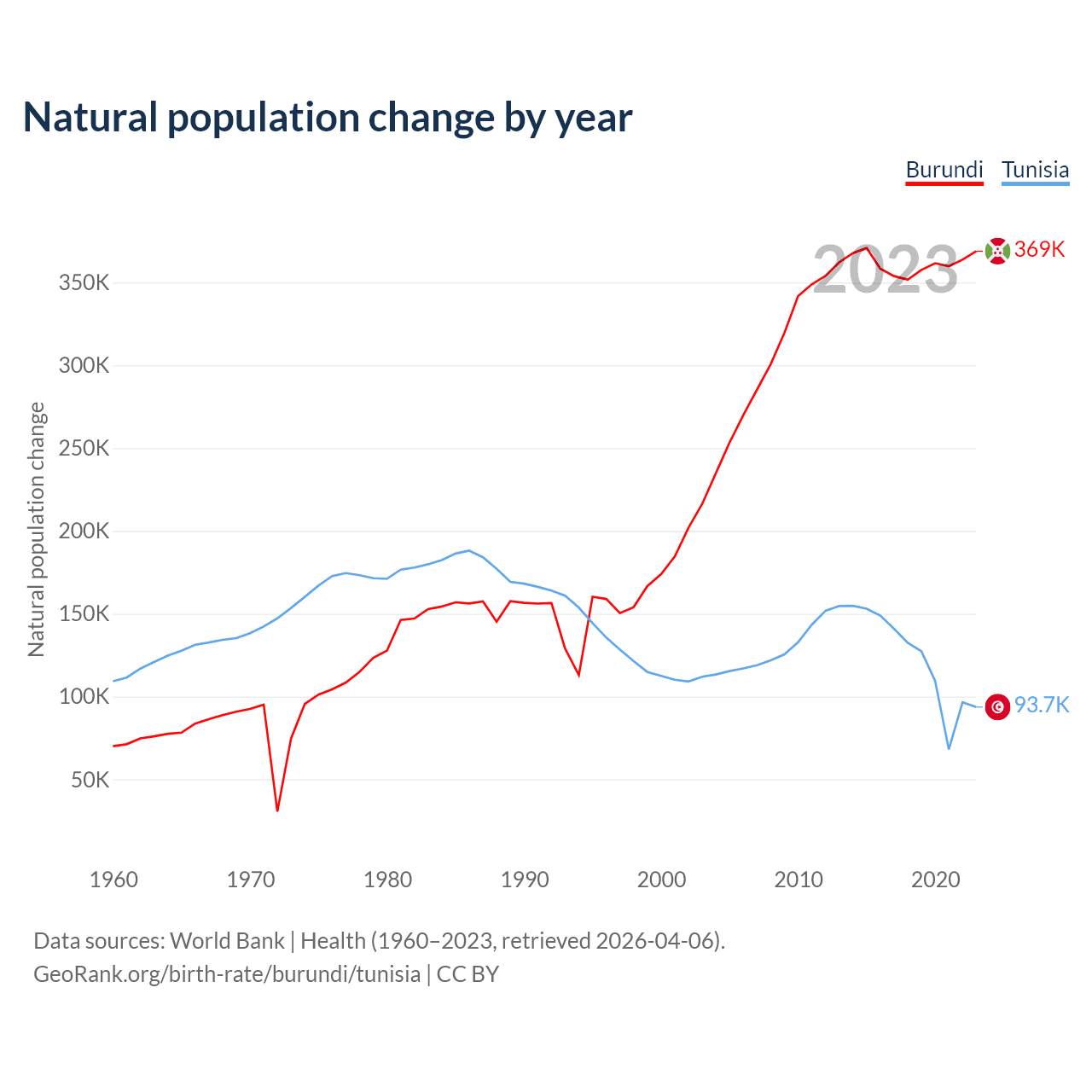 - Burundi is ranked 17/196 by birth rate compared to 104/196 for Tunisia.