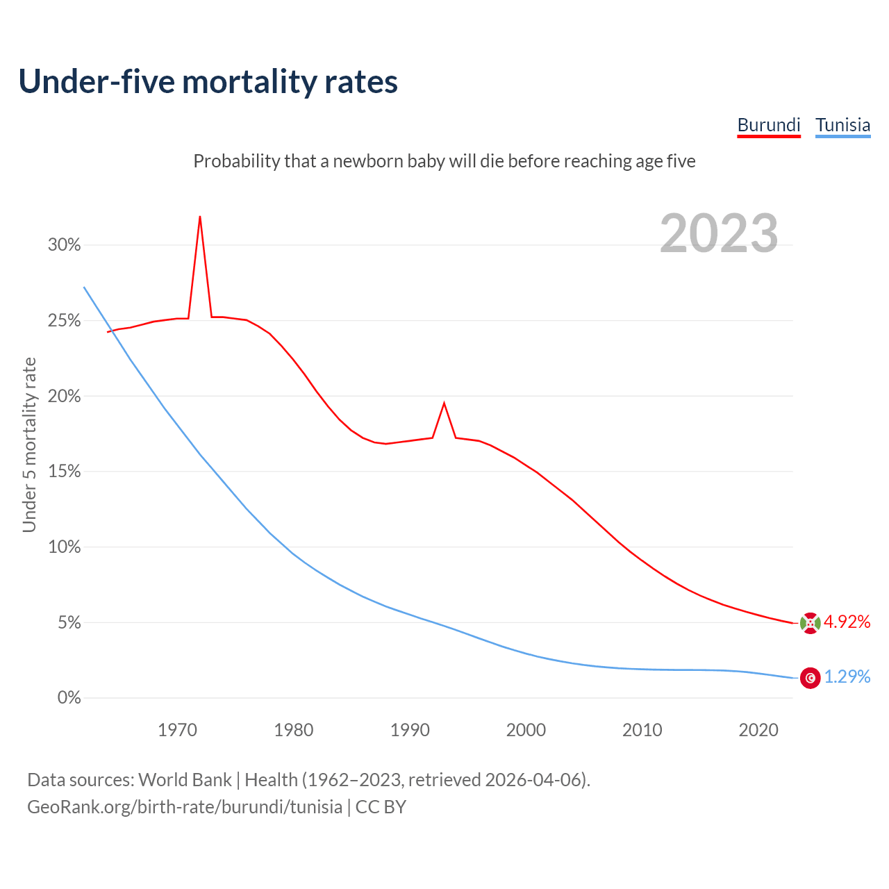 The chance that a newborn baby will die before reaching age five is 4.92% in Burundi and 1.29% in Tunisia. Above is a chart with historical data on under-five mortality rates.