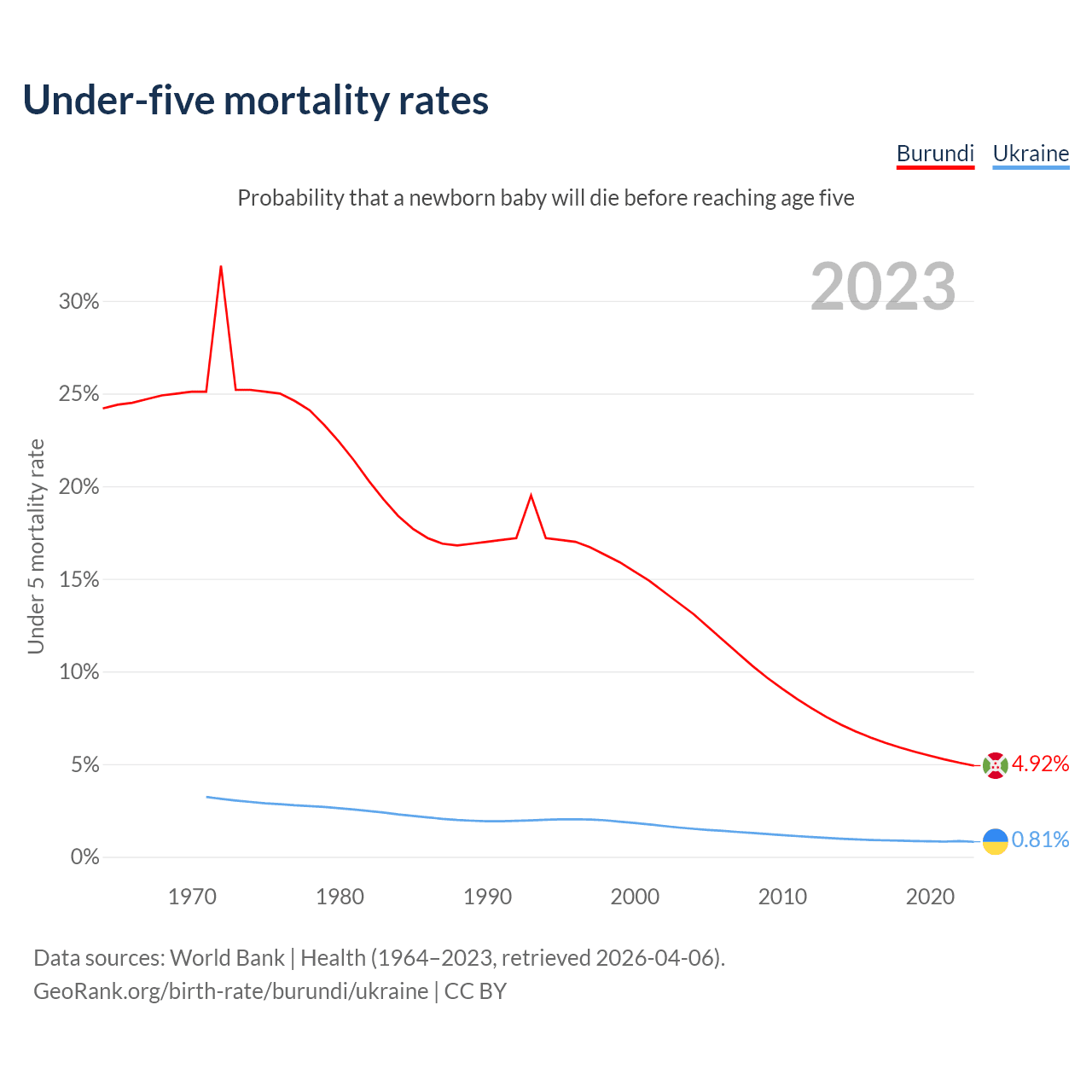 The chance that a newborn baby will die before reaching age five is 4.92% in Burundi and 0.81% in Ukraine. Above is a chart with historical data on under-five mortality rates.