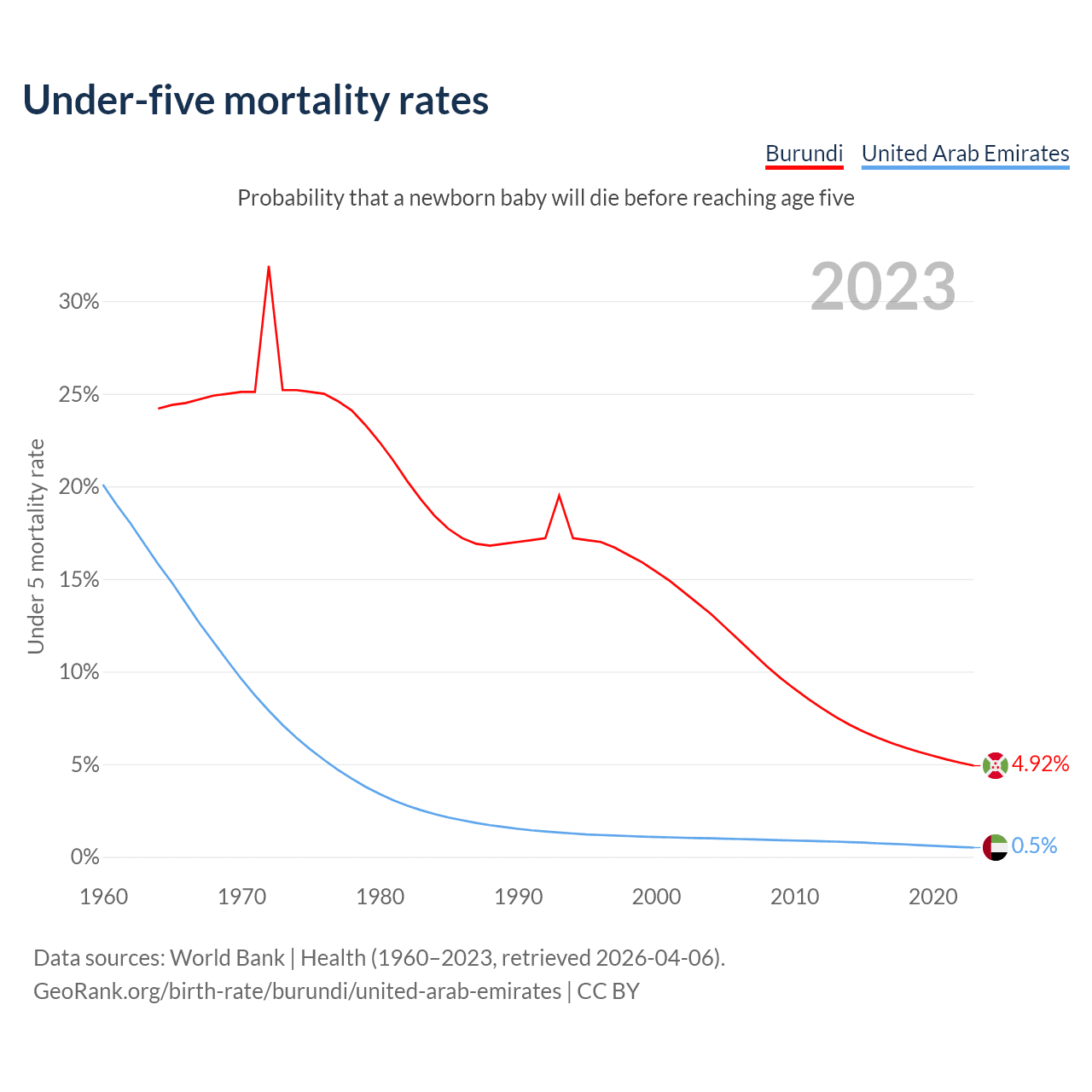 The chance that a newborn baby will die before reaching age five is 4.92% in Burundi and 0.5% in the United Arab Emirates. Above is a chart with historical data on under-five mortality rates.