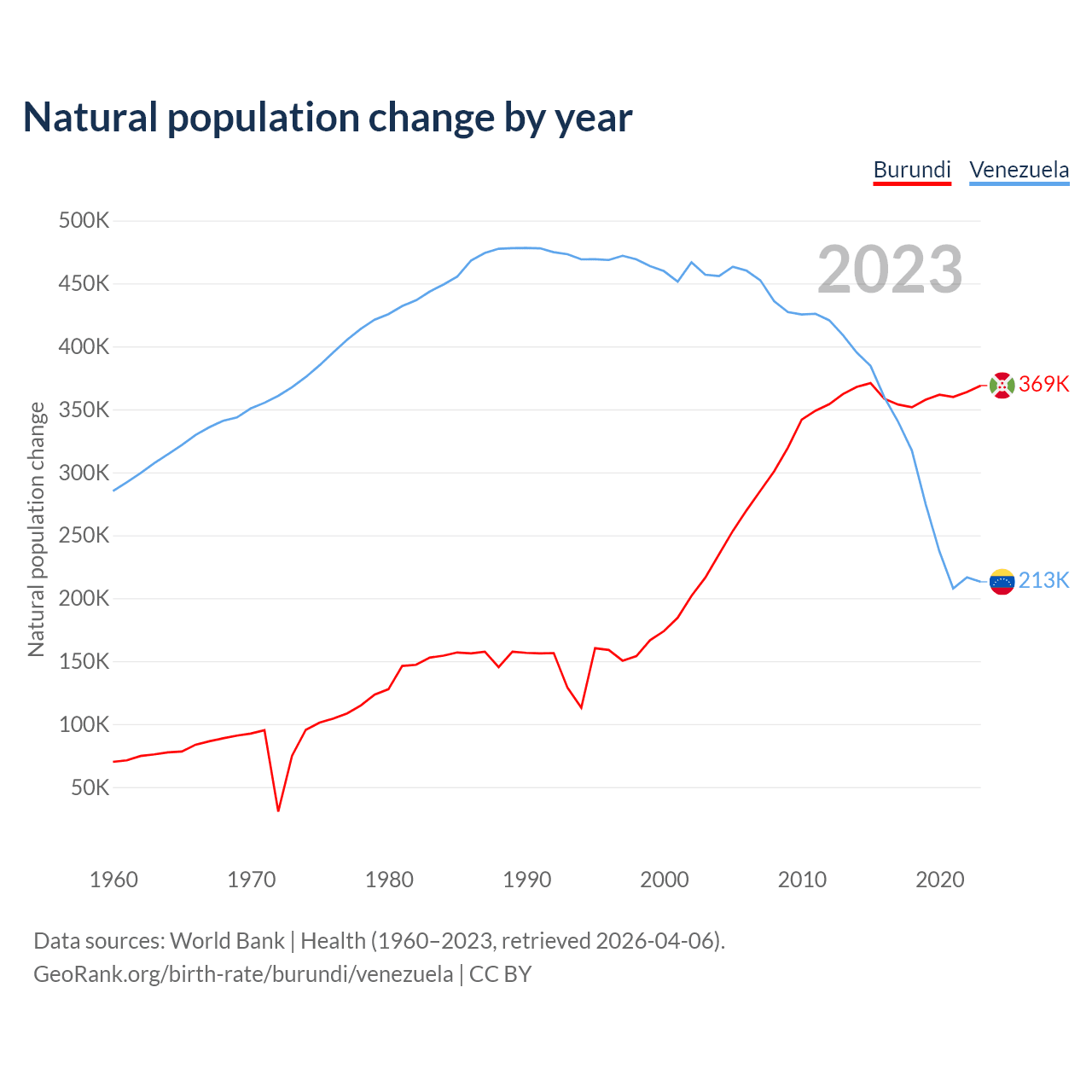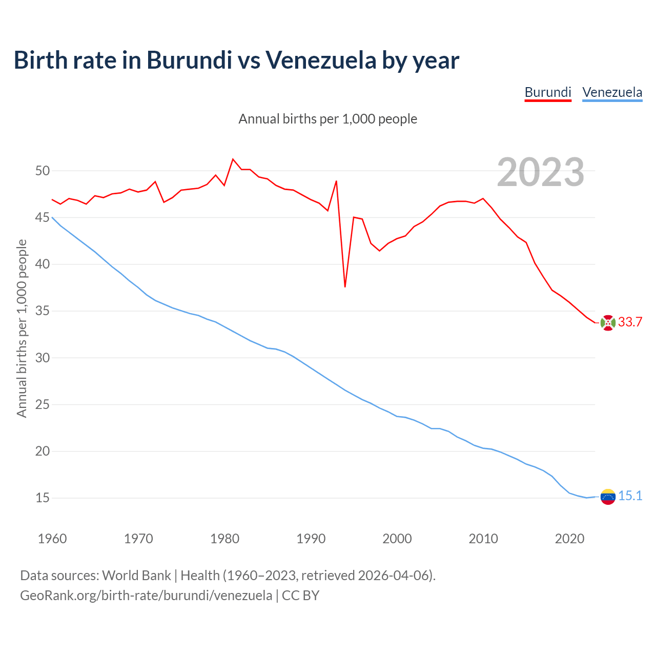 Burundi has an annual birth rate of 33.7 births per 1,000 people, compared to 15.1 for Venezuela. The average number of children a woman is expected to have during her lifetime — the fertility rate, is 4.88 in Burundi and 2.08 in Venezuela — 57.4% difference.