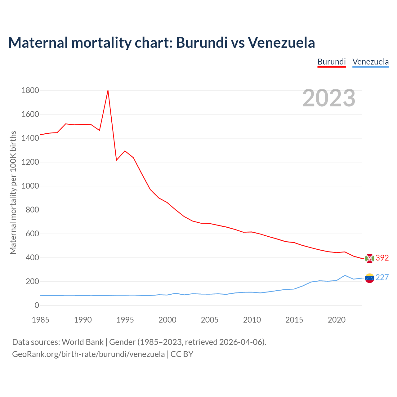 The maternal mortality rate, which is the probability of dying during childbirth or within 42 days of pregnancy termination, is 392 deaths per 100,000 live births in Burundi, compared to 227 deaths in Venezuela.