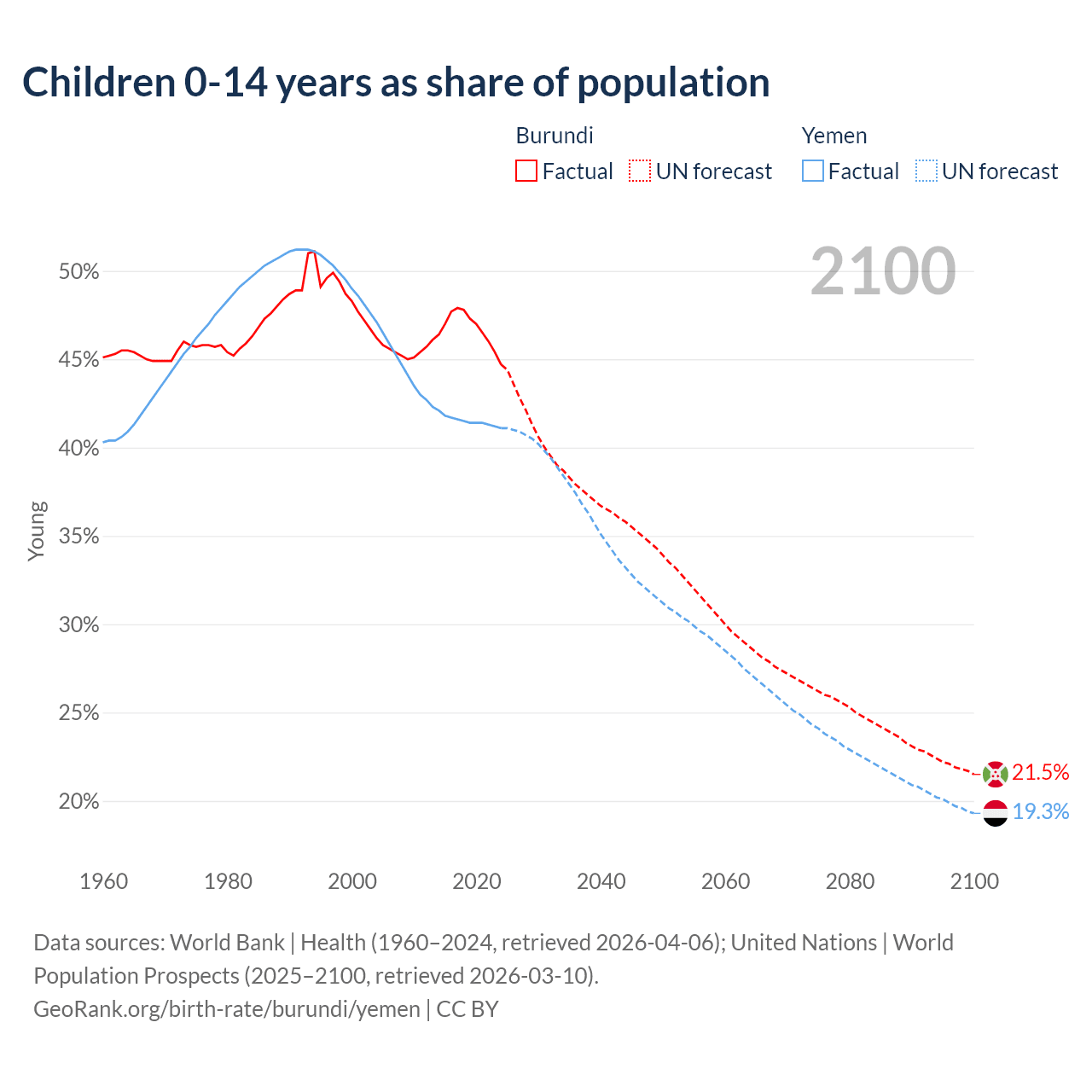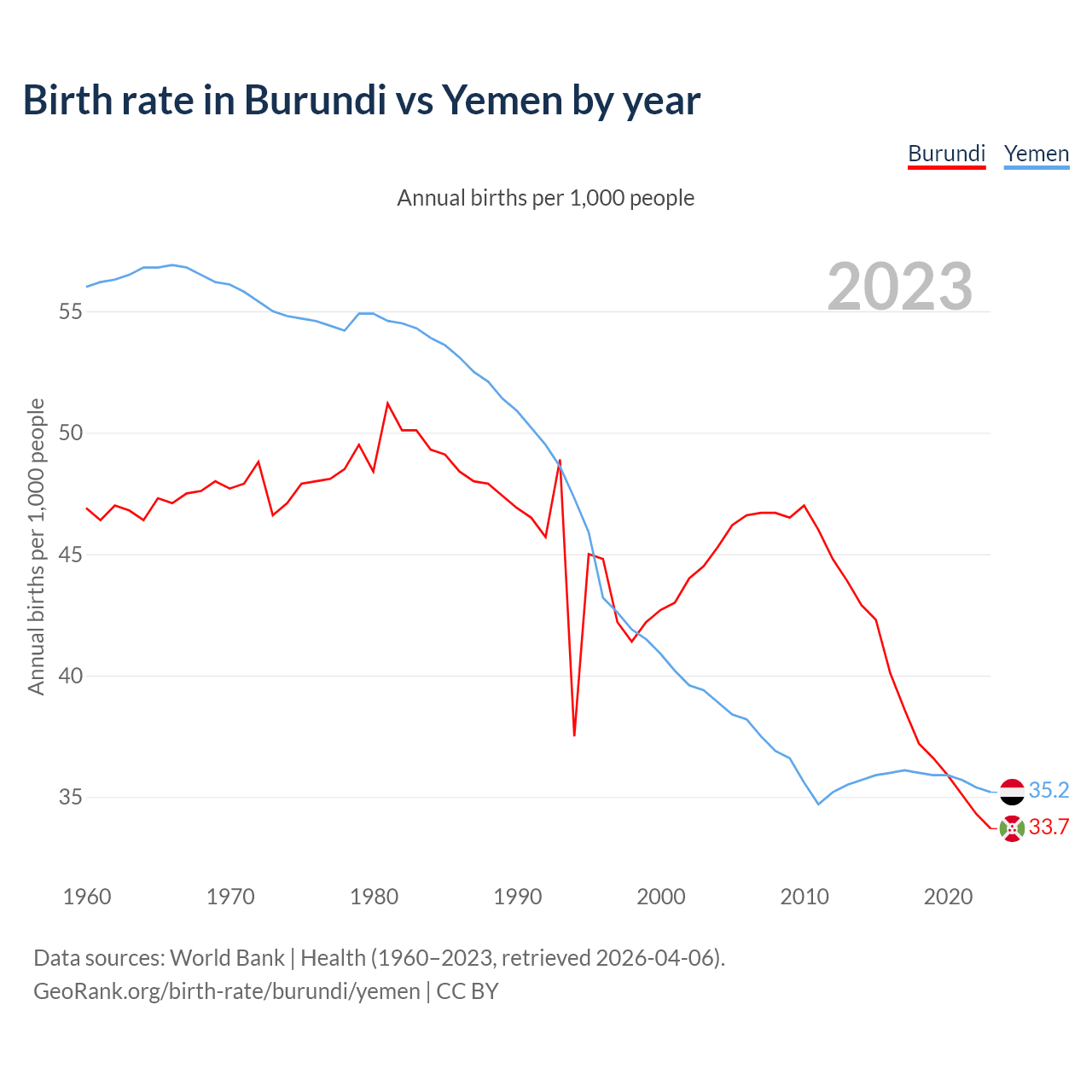 Burundi has an annual birth rate of 33.7 births per 1,000 people, compared to 35.2 for Yemen. The average number of children a woman is expected to have during her lifetime — the fertility rate, is 4.88 in Burundi and 4.59 in Yemen — 5.9% difference.