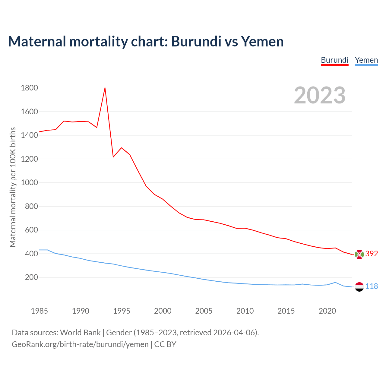The maternal mortality rate, which is the probability of dying during childbirth or within 42 days of pregnancy termination, is 392 deaths per 100,000 live births in Burundi, compared to 118 deaths in Yemen.