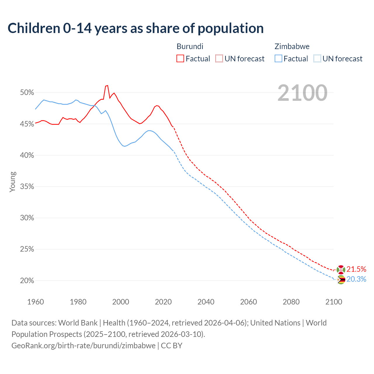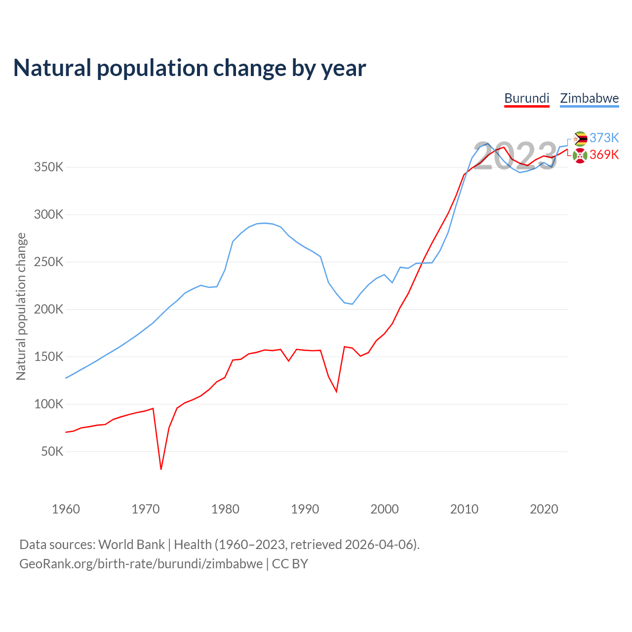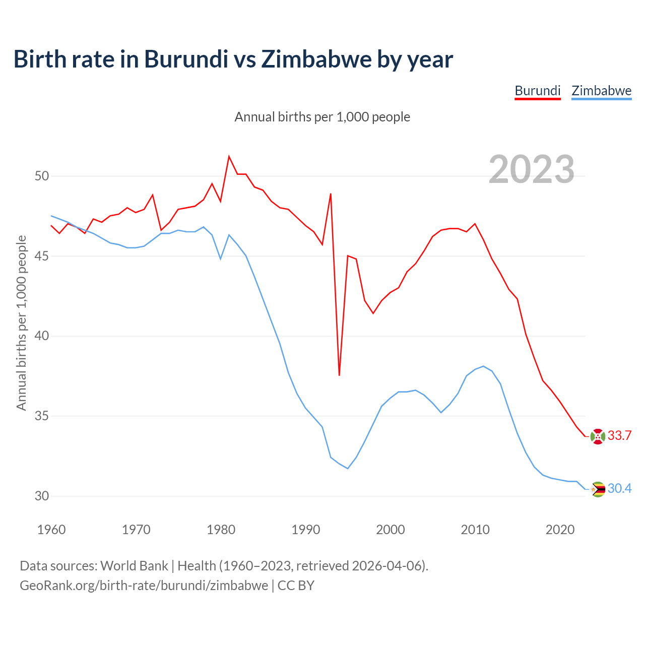 Burundi has an annual birth rate of 33.7 births per 1,000 people, compared to 30.4 for Zimbabwe. The average number of children a woman is expected to have during her lifetime — the fertility rate, is 4.88 in Burundi and 3.72 in Zimbabwe — 23.7% difference.