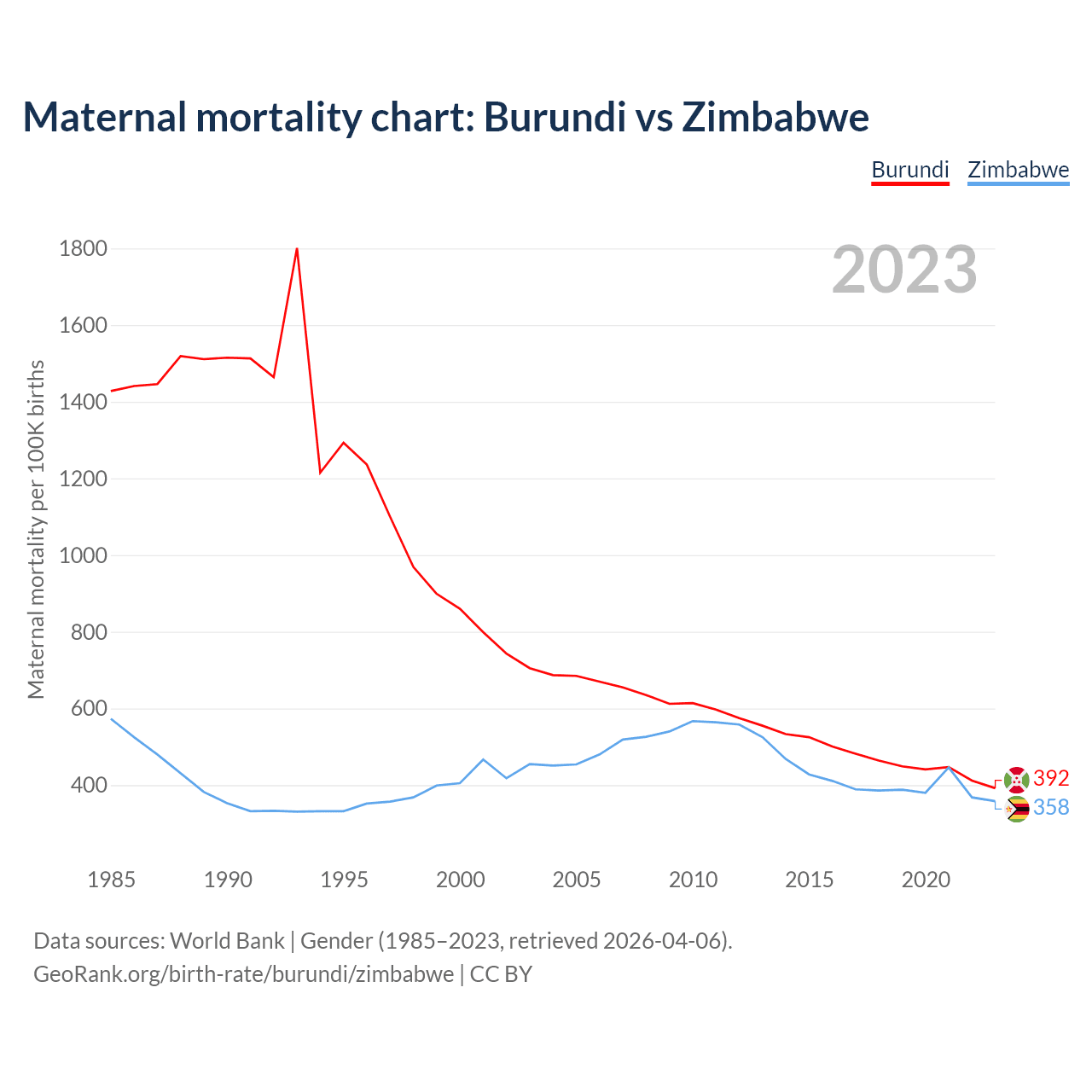 The maternal mortality rate, which is the probability of dying during childbirth or within 42 days of pregnancy termination, is 392 deaths per 100,000 live births in Burundi, compared to 358 deaths in Zimbabwe.