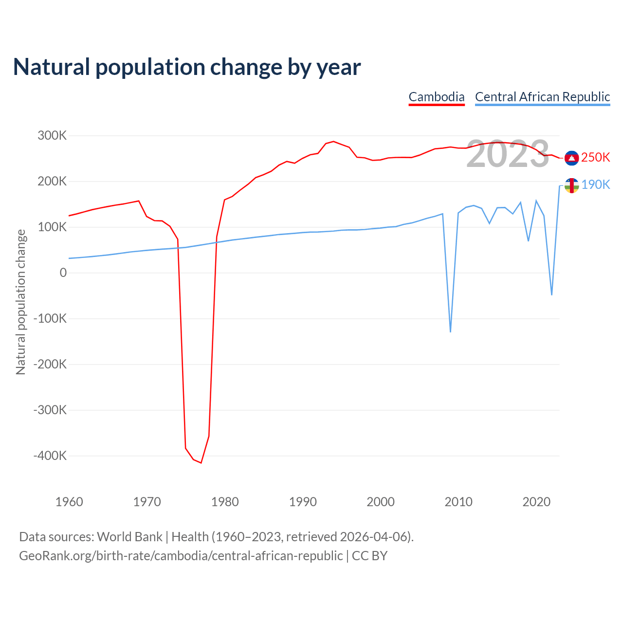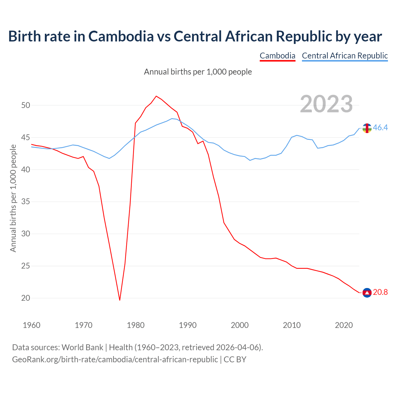 Cambodia has an annual birth rate of 20.8 births per 1,000 people, compared to 46.4 for the Central African Republic. The average number of children a woman is expected to have during her lifetime — the fertility rate, is 2.58 in Cambodia and 6.01 in the Central African Republic — 133.1% difference.