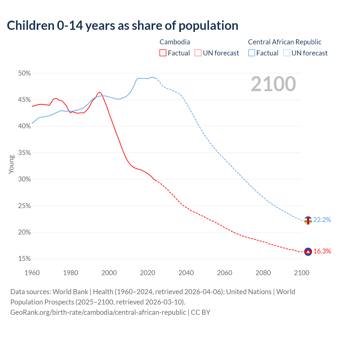 According to the latest available data on birth rates, the fertility rate in Cambodia was 2.58 children per woman in 2023, compared to 6.01 in the Central African Republic in 2023. The replacement level is considered to be 2.1 children per woman.