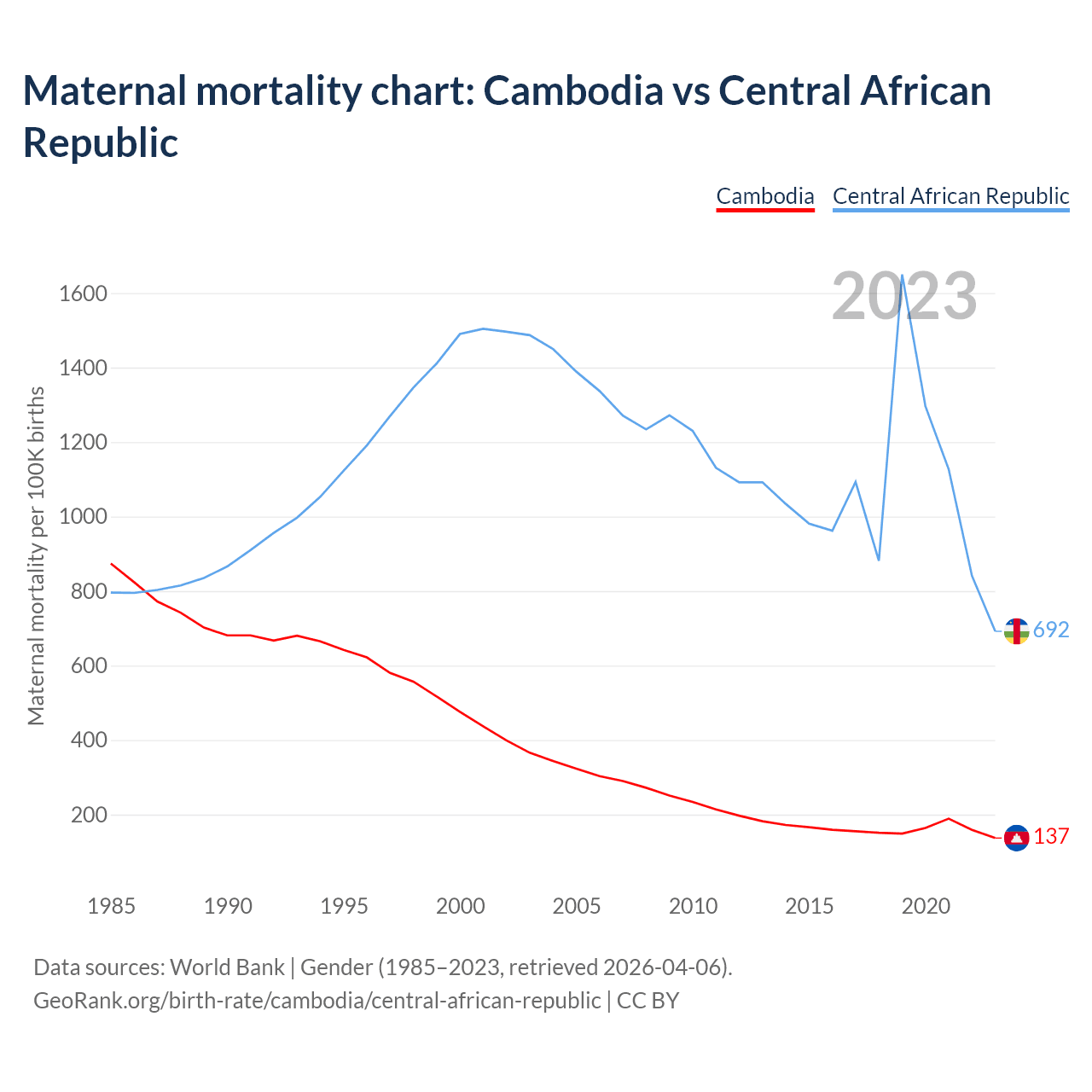 The maternal mortality rate, which is the probability of dying during childbirth or within 42 days of pregnancy termination, is 137 deaths per 100,000 live births in Cambodia, compared to 692 deaths in the Central African Republic.