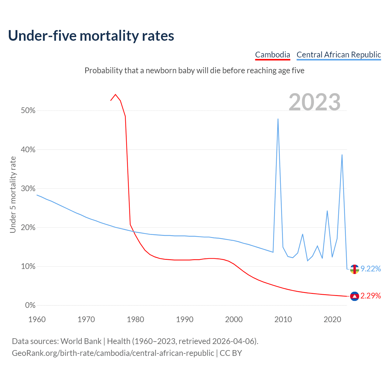 The chance that a newborn baby will die before reaching age five is 2.29% in Cambodia and 9.22% in the Central African Republic. Above is a chart with historical data on under-five mortality rates.