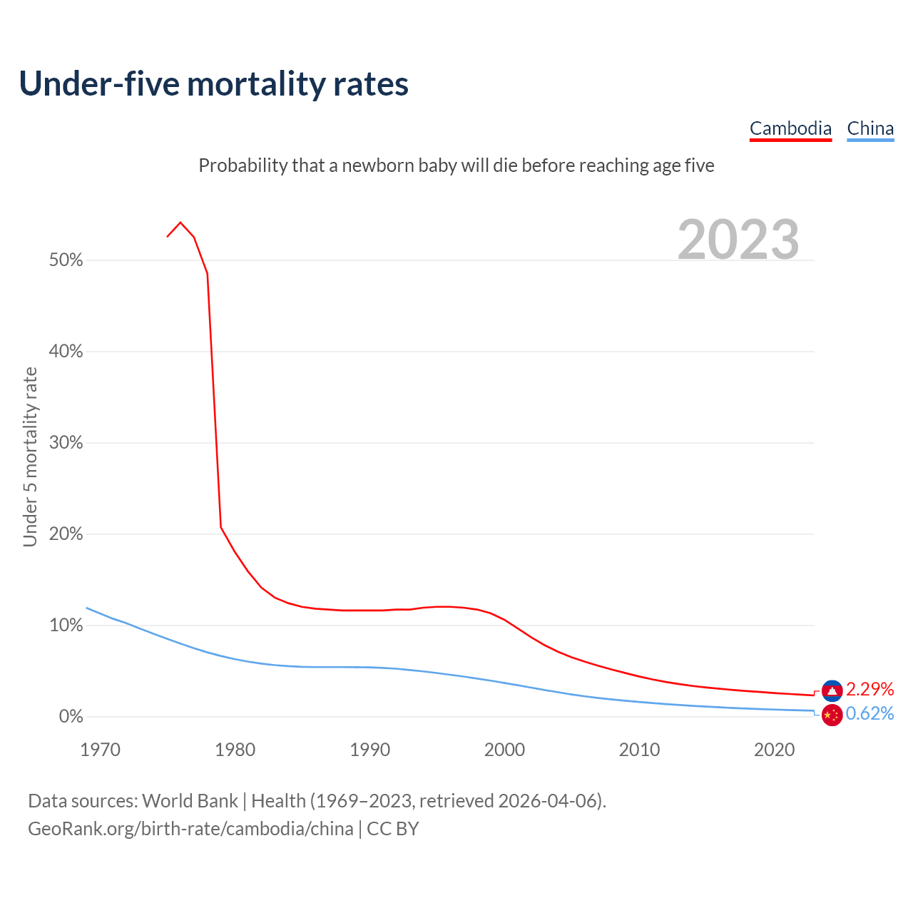 The chance that a newborn baby will die before reaching age five is 2.29% in Cambodia and 0.62% in China. Above is a chart with historical data on under-five mortality rates.