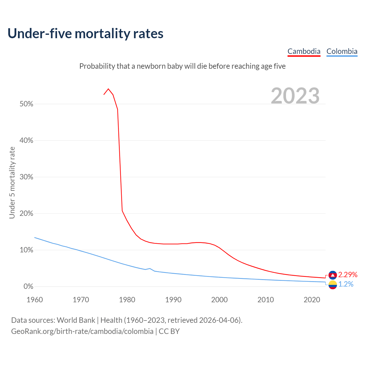 The chance that a newborn baby will die before reaching age five is 2.29% in Cambodia and 1.2% in Colombia. Above is a chart with historical data on under-five mortality rates.