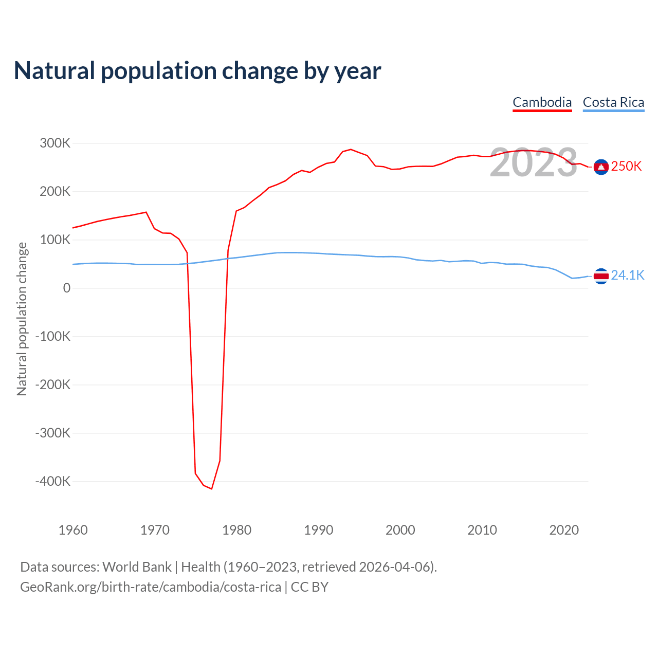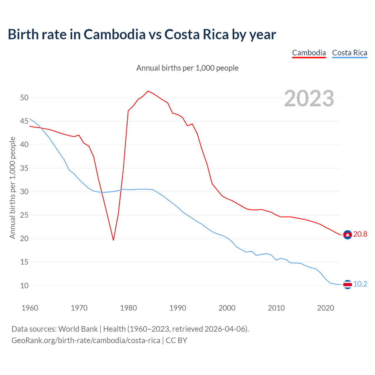 Cambodia has an annual birth rate of 20.8 births per 1,000 people, compared to 10.2 for Costa Rica. The average number of children a woman is expected to have during her lifetime — the fertility rate, is 2.58 in Cambodia and 1.33 in Costa Rica — 48.4% difference.