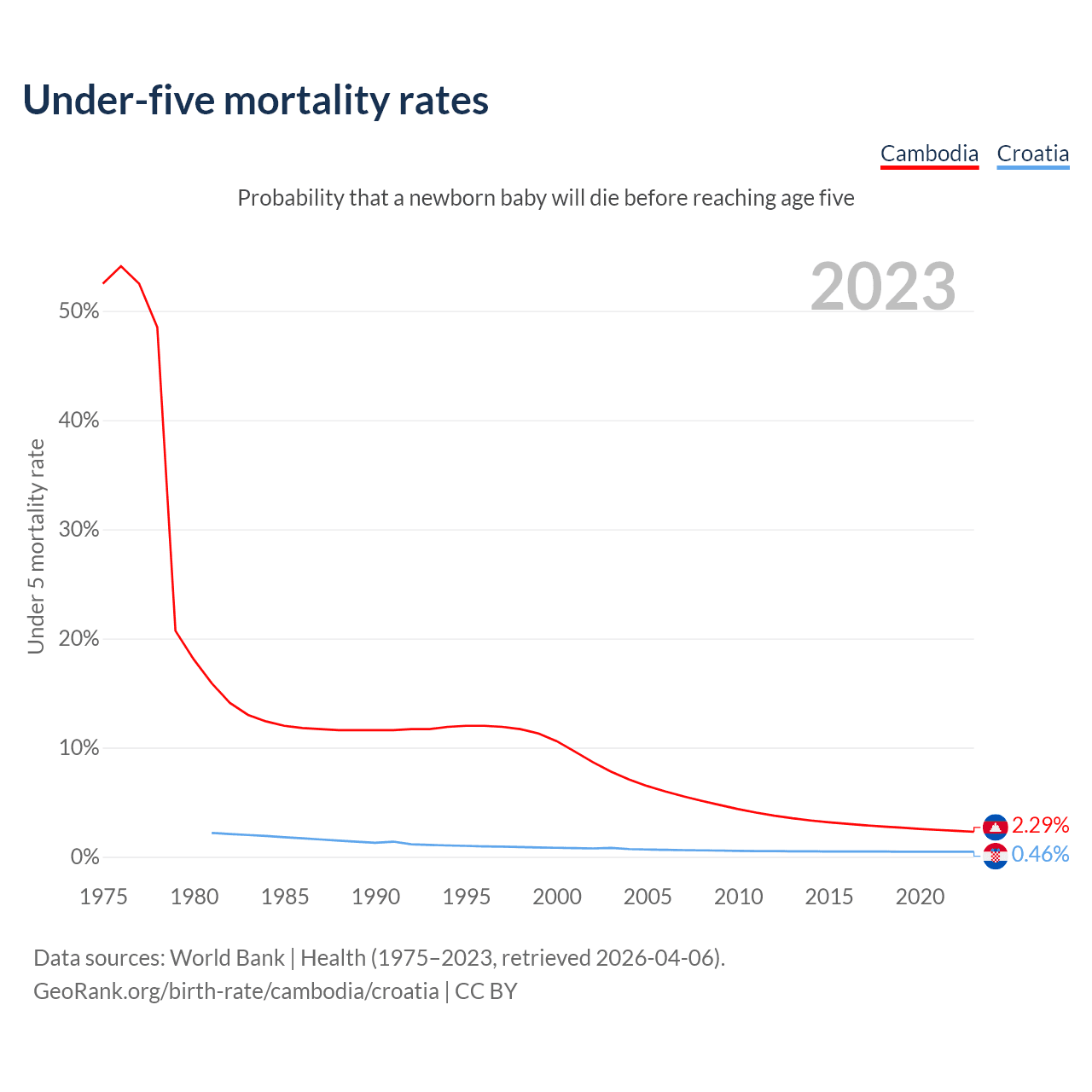 The chance that a newborn baby will die before reaching age five is 2.29% in Cambodia and 0.46% in Croatia. Above is a chart with historical data on under-five mortality rates.