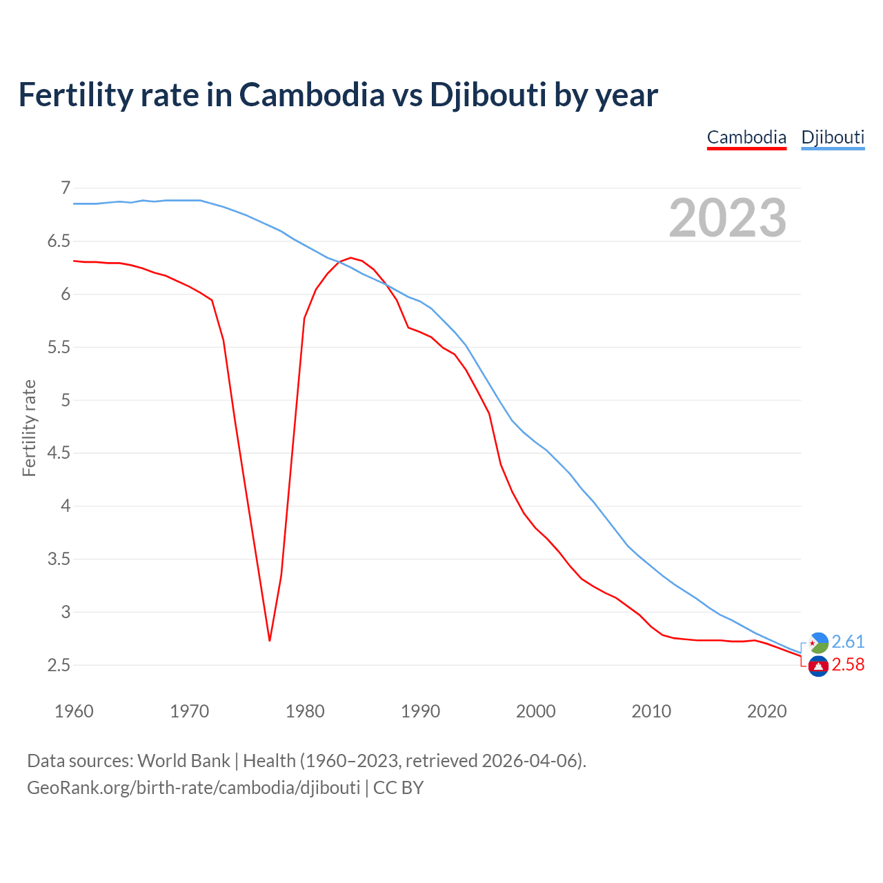 1960 vs 2023, the fertility rate has decreased by 59.1% in Cambodia and by 61.9% in Djibouti — in 1960, it was 6.31 and 6.85, respectively.
