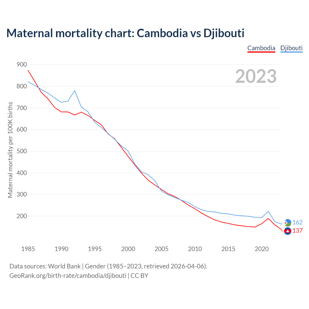 The maternal mortality rate, which is the probability of dying during childbirth or within 42 days of pregnancy termination, is 137 deaths per 100,000 live births in Cambodia, compared to 162 deaths in Djibouti.
