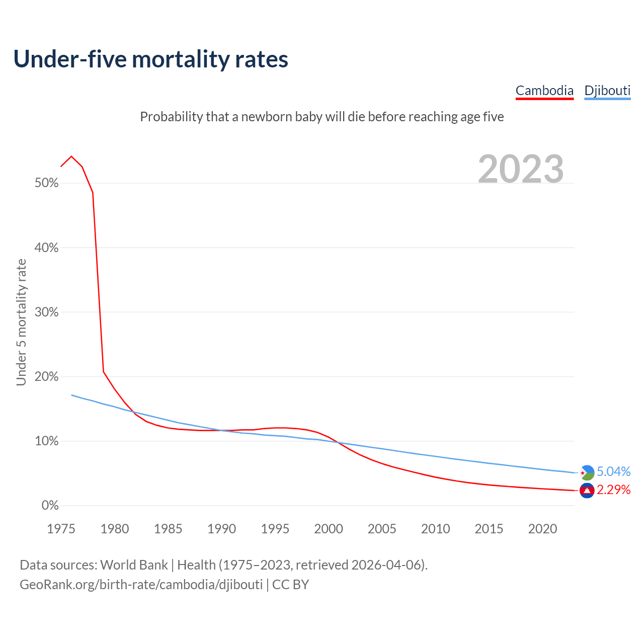 The chance that a newborn baby will die before reaching age five is 2.29% in Cambodia and 5.04% in Djibouti. Above is a chart with historical data on under-five mortality rates.