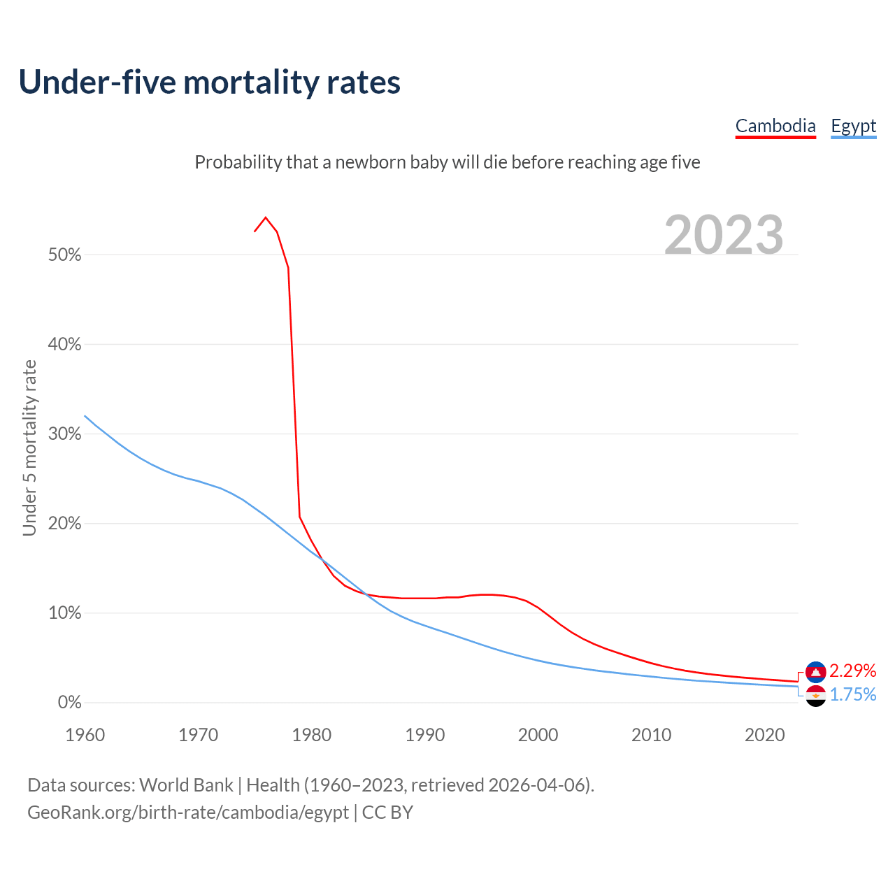 The chance that a newborn baby will die before reaching age five is 2.29% in Cambodia and 1.75% in Egypt. Above is a chart with historical data on under-five mortality rates.
