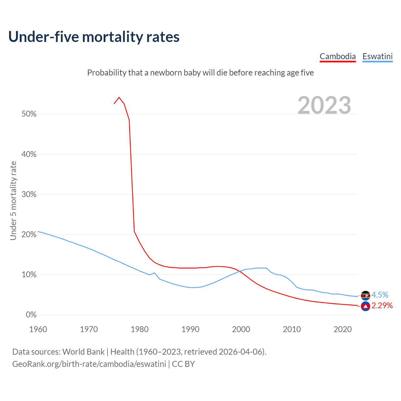 The chance that a newborn baby will die before reaching age five is 2.29% in Cambodia and 4.5% in Eswatini. Above is a chart with historical data on under-five mortality rates.