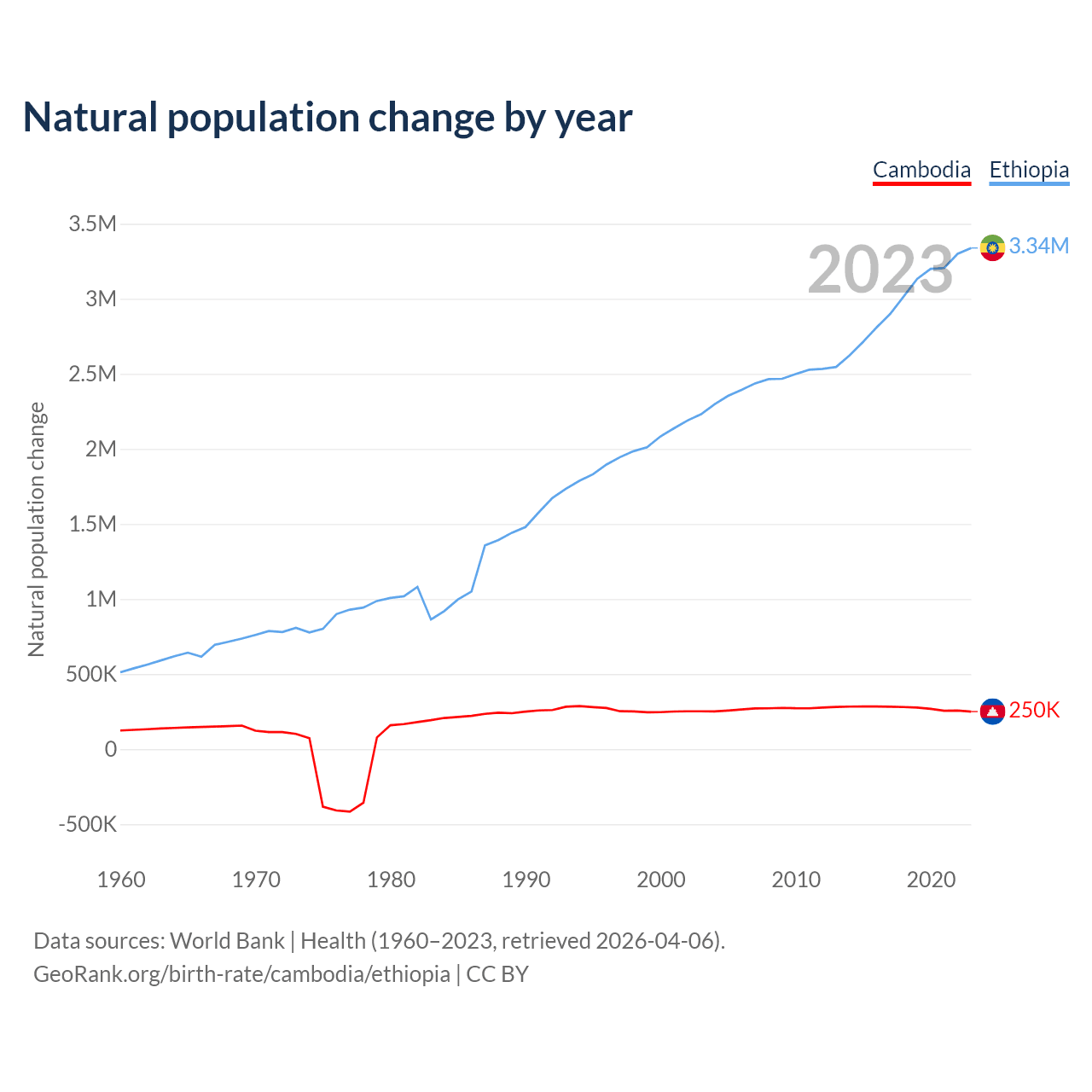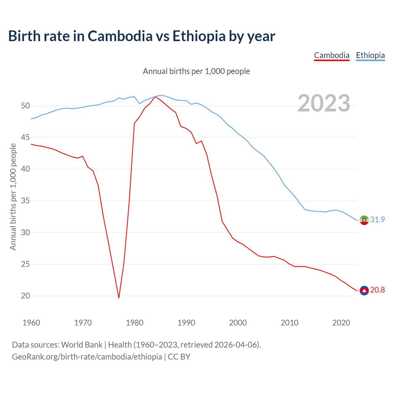 Cambodia has an annual birth rate of 20.8 births per 1,000 people, compared to 31.9 for Ethiopia. The average number of children a woman is expected to have during her lifetime — the fertility rate, is 2.58 in Cambodia and 3.99 in Ethiopia — 54.7% difference.