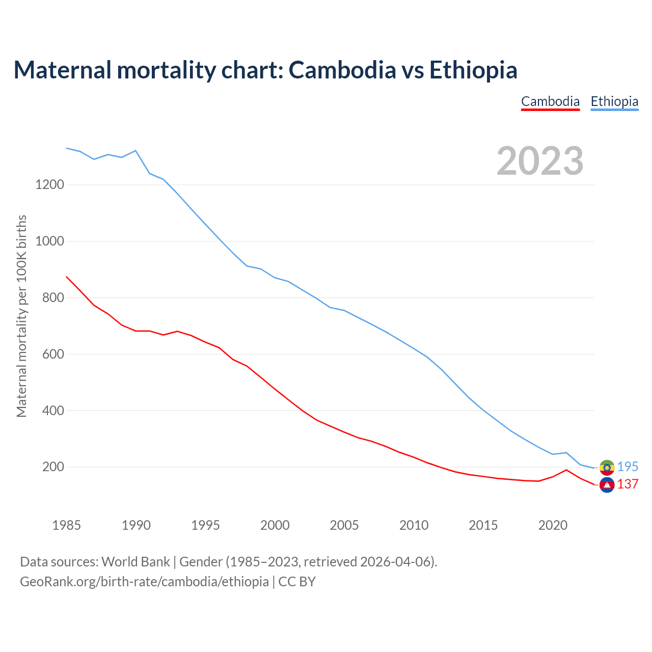 - Annual births per 1,000 women ages 15-19 (adolescent birth rate or teenage mother rate) is 46.9 in Cambodia vs 69.9 in Ethiopia.