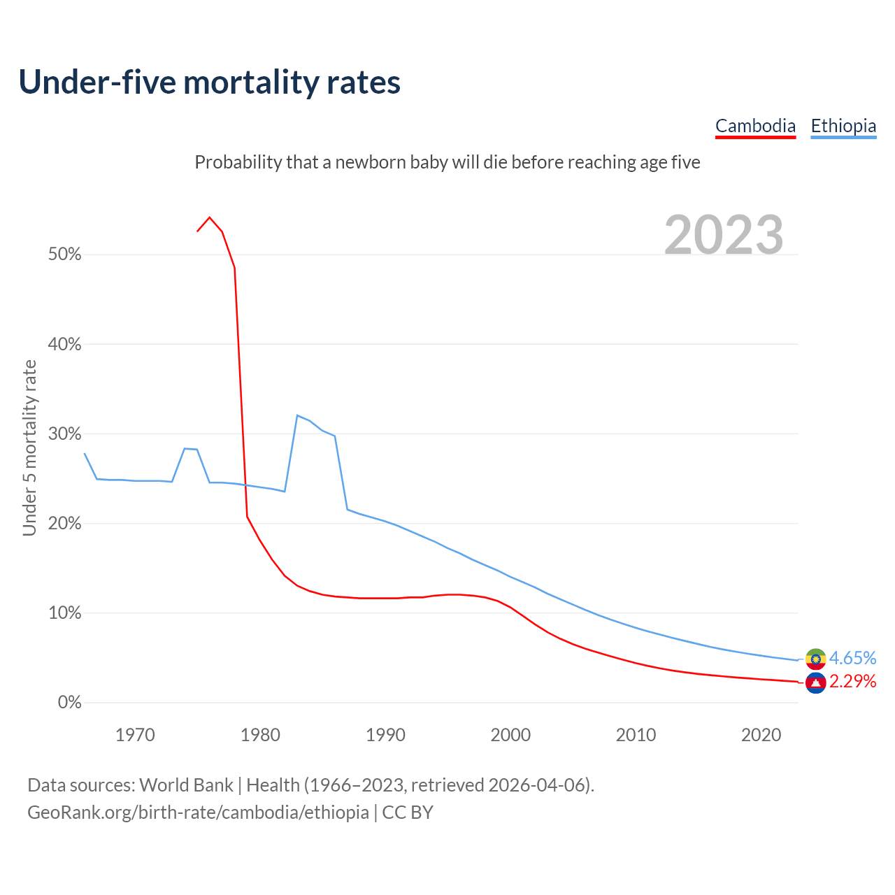 The chance that a newborn baby will die before reaching age five is 2.29% in Cambodia and 4.65% in Ethiopia. Above is a chart with historical data on under-five mortality rates.