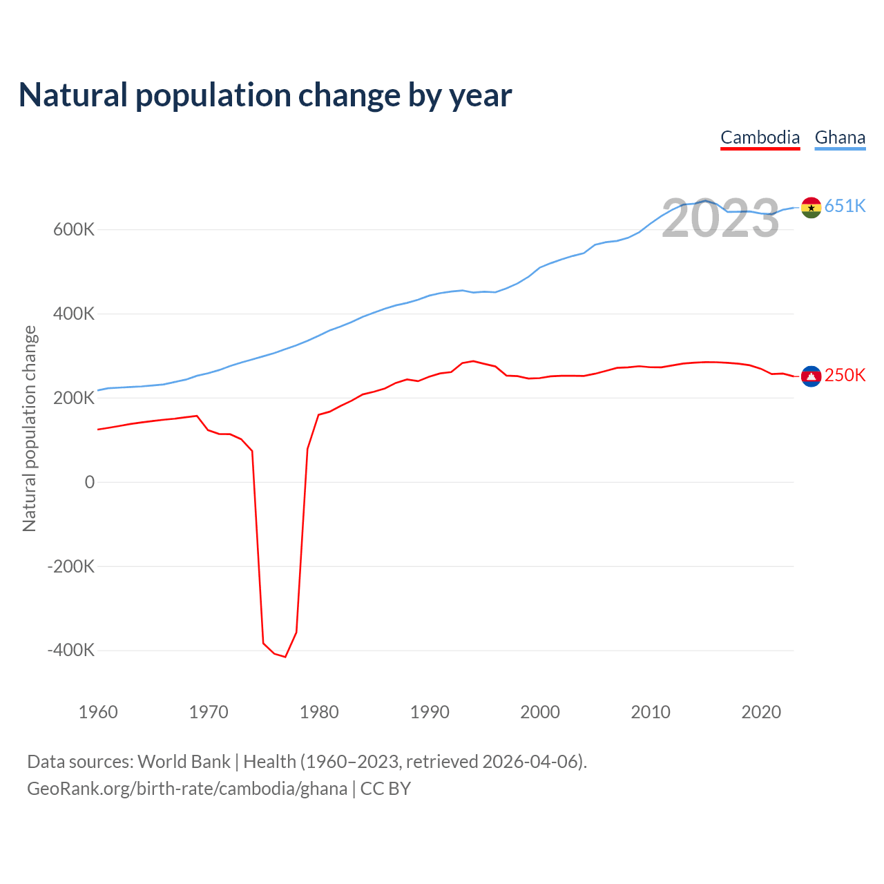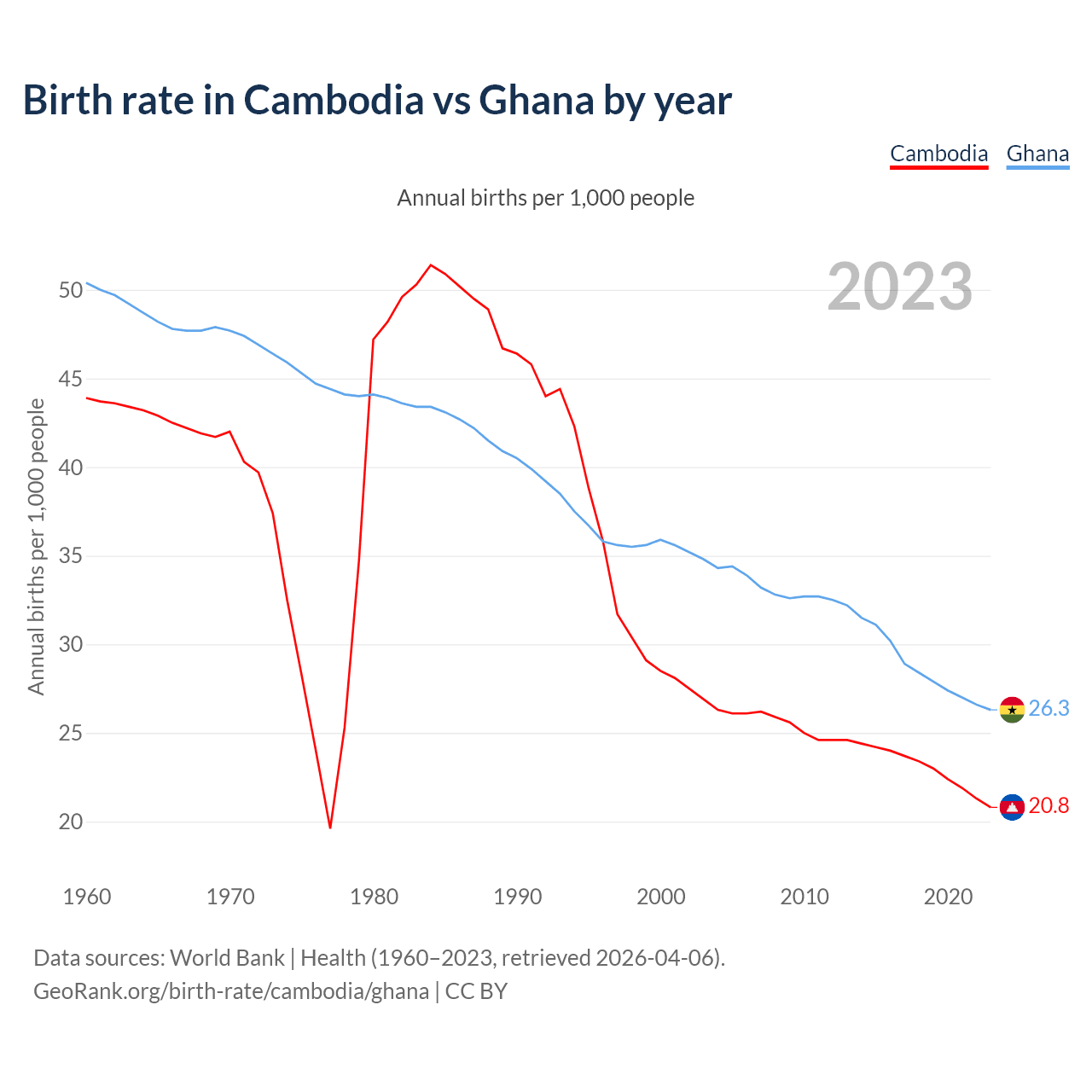 Cambodia has an annual birth rate of 20.8 births per 1,000 people, compared to 26.3 for Ghana. The average number of children a woman is expected to have during her lifetime — the fertility rate, is 2.58 in Cambodia and 3.4 in Ghana — 31.7% difference.