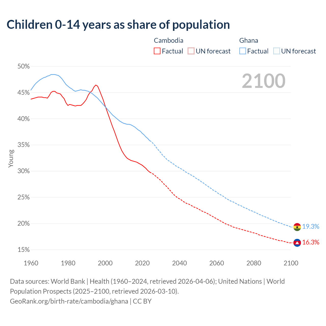 According to the latest available data on birth rates, the fertility rate in Cambodia was 2.58 children per woman in 2023, compared to 3.4 in Ghana in 2023. The replacement level is considered to be 2.1 children per woman.